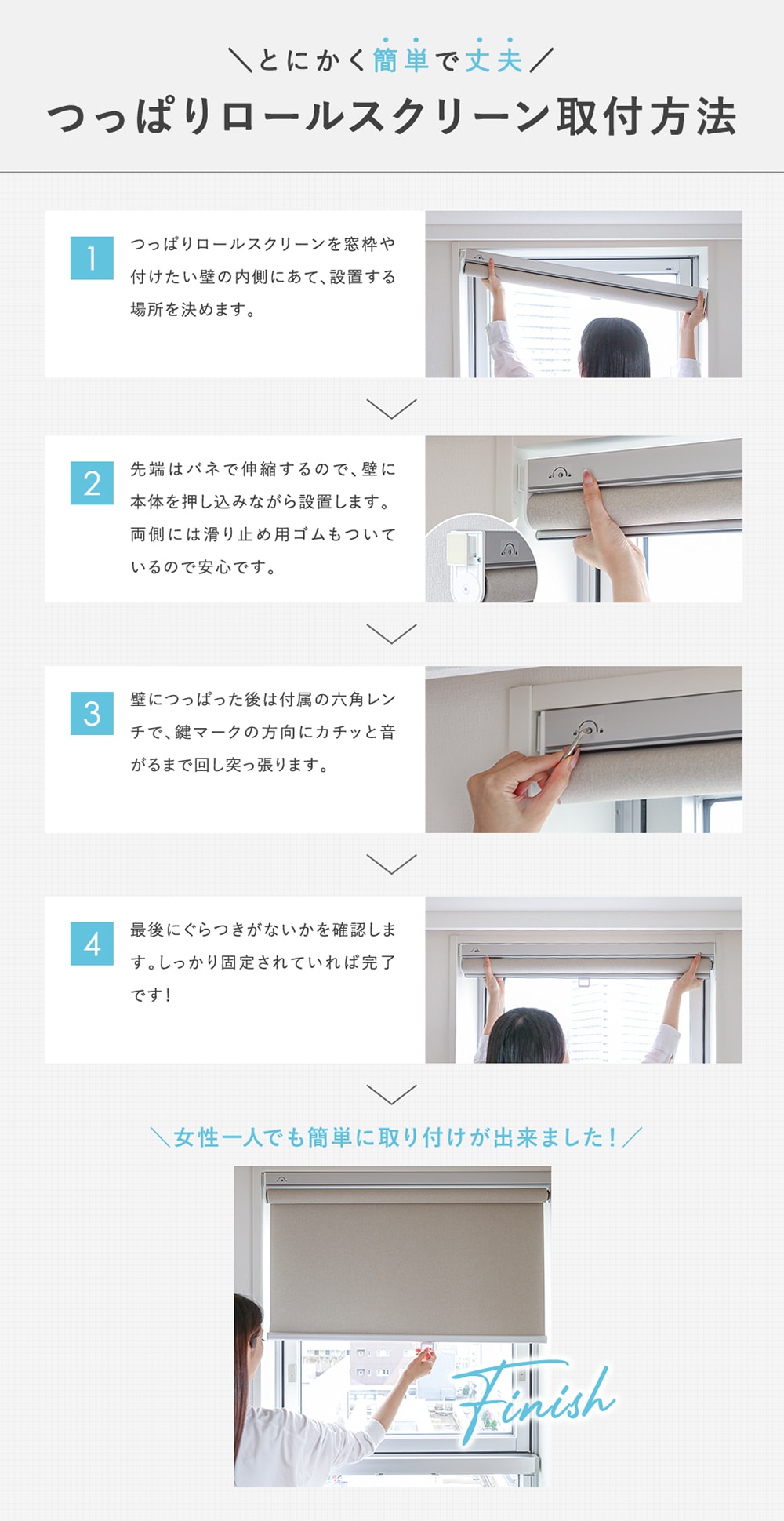賃貸でもOK、工事不要・穴あけ不要で、つっぱり棒のように、どこでも簡単に取り付け出来る、便利で手軽なロールスクリーン。