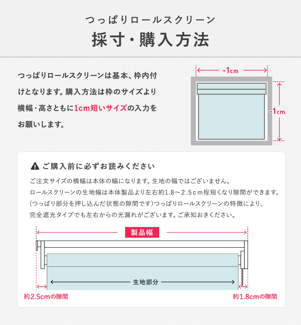 こちらのロールスクリーンは、つっぱり式なのに、左右の隙間が少ないところも優れポイント。通常、つっぱりロールスクリーンは、つっぱるメカの特性上、左右共に約3cm程の隙間が出来てしまうものが多いのですが、こちらは、左右の隙間が約1~2cmと最小限に抑えられているんです。