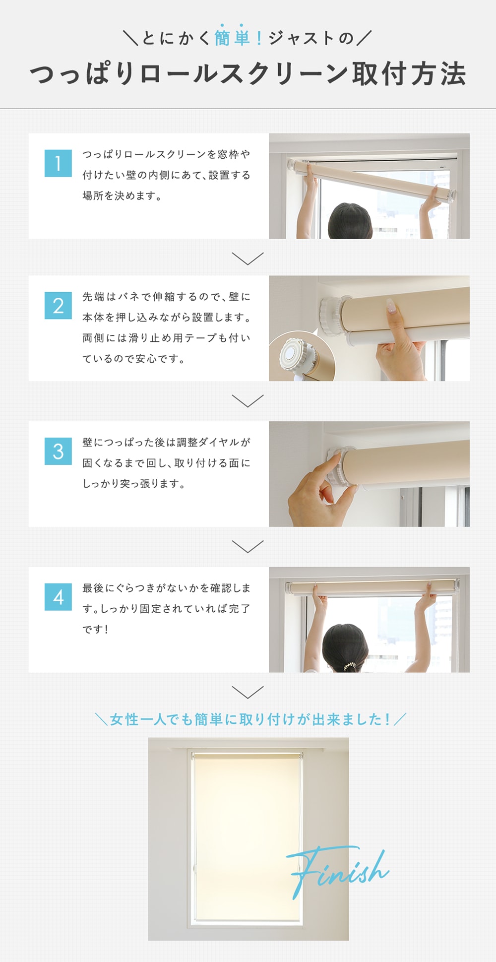 人気のロールスクリーンを窓枠に突っ張るだけで設置完了!誰でもどこでもとにかく「簡単」なのが、つっぱりロールスクリーンの最大の魅力です。