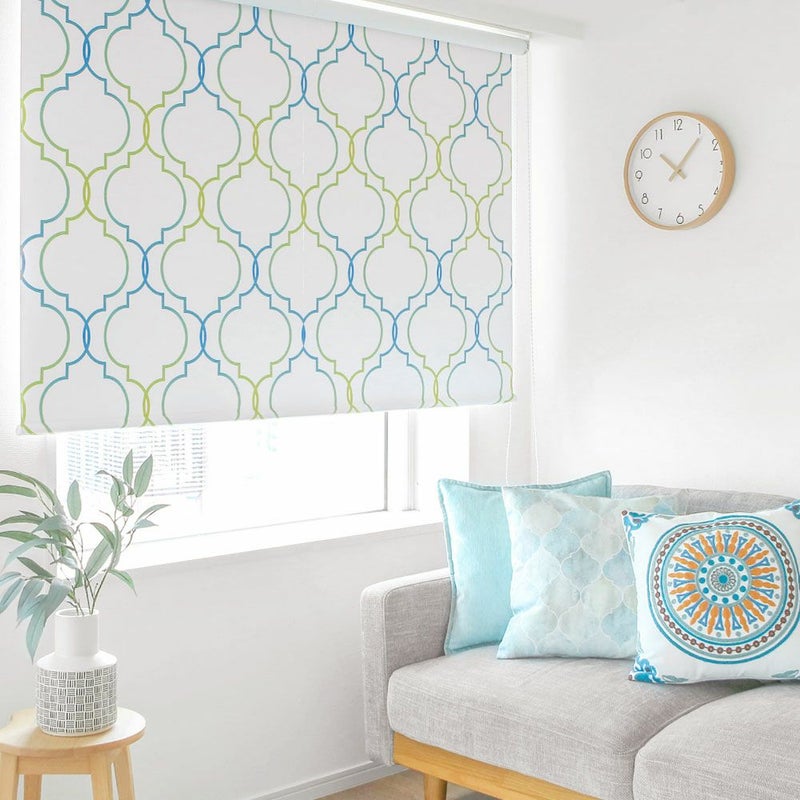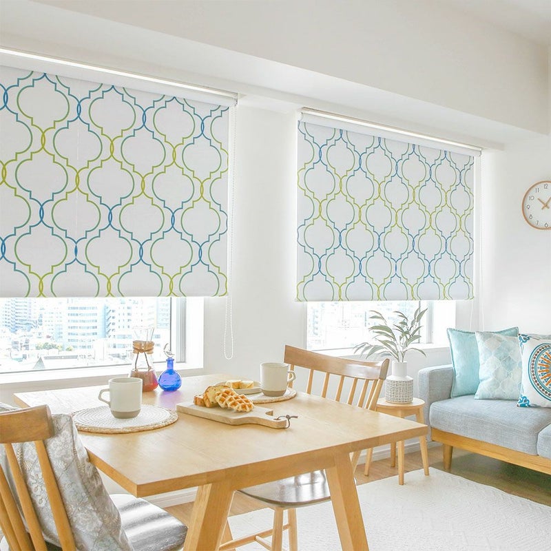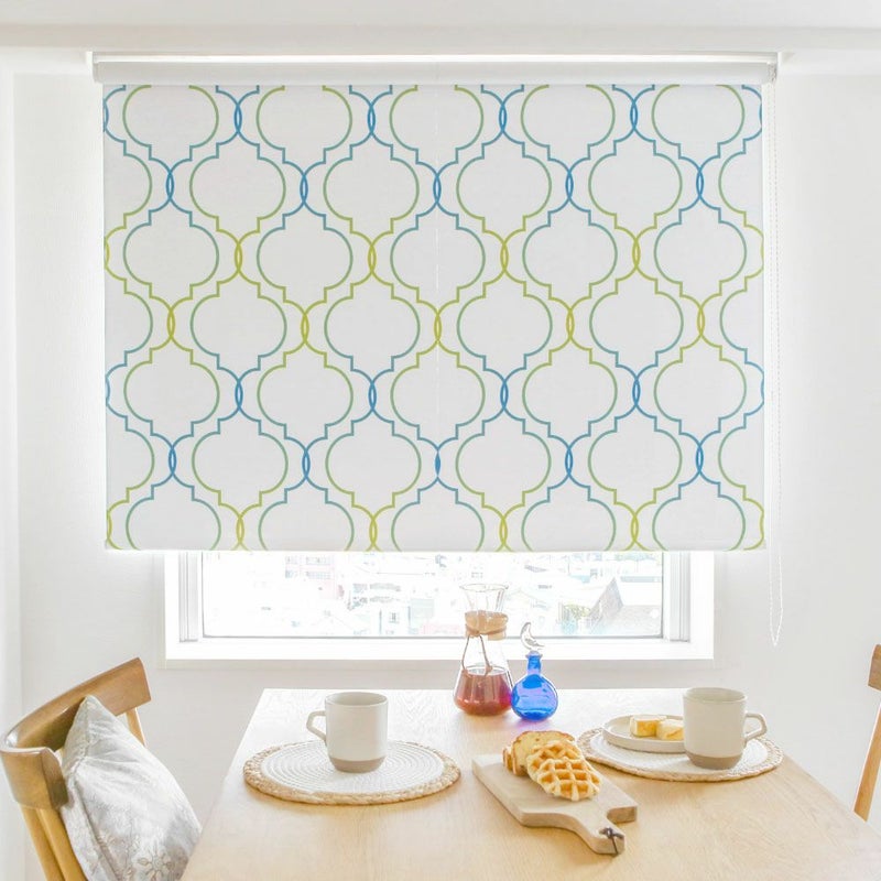 見るたびに愛着が沸き、お部屋に入った瞬間にパッと明るく適度な華やかさを感じる<エメ ロールスクリーン>。窓にかけてみると想像以上に可愛く、イマドキのモロッカンスタイルに仕上がります。