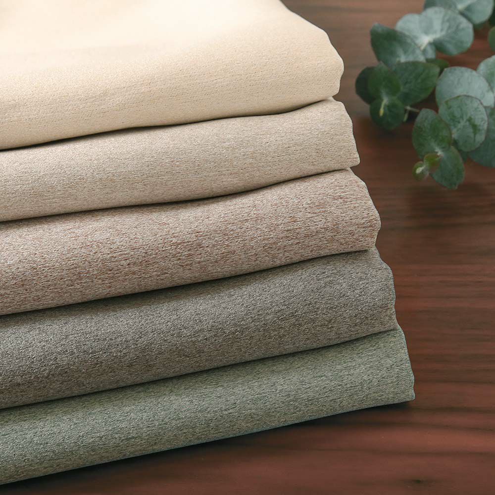 <※加工前のカーテン生地で撮影>無地は無地でも、のっぺりしないおしゃれな生地感の5色をご用意いたしました。やわらかな生成りが優しい表情のエクリュ、馴染みの良さNo.1のベージュ、ほんのりと赤みがかった絶妙ブラウンのココア、クールでスタイリッシュなグレー、爽やかで心安らぐ癒しのグリーン。濃淡の異なる糸が織りなす、美しい艶感と絶妙なニュアンスカラーをお楽しみください。
