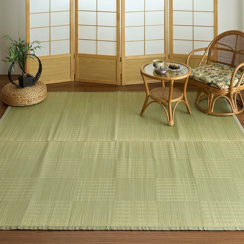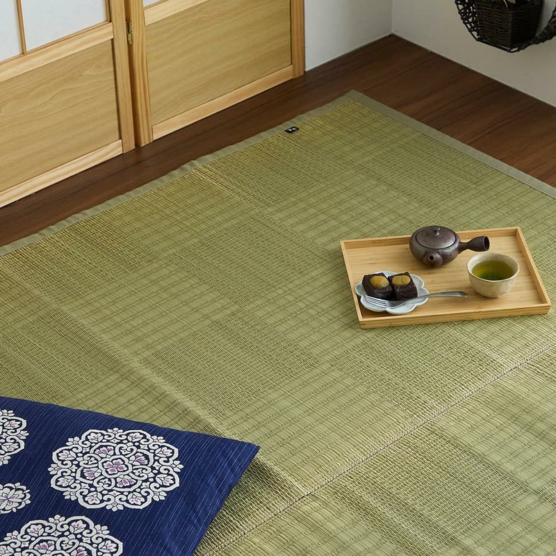 光のあたり具合によって、ほんのりと浮き上がる市松模様が高級感と味わい深い雰囲気を漂わせます。シンプルだからこそ、い草の質感が映える上質な上敷きです。