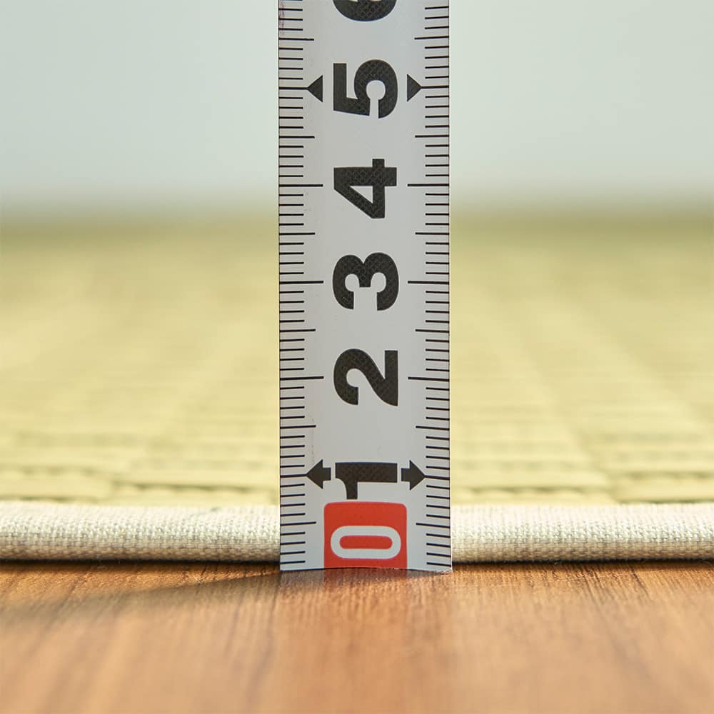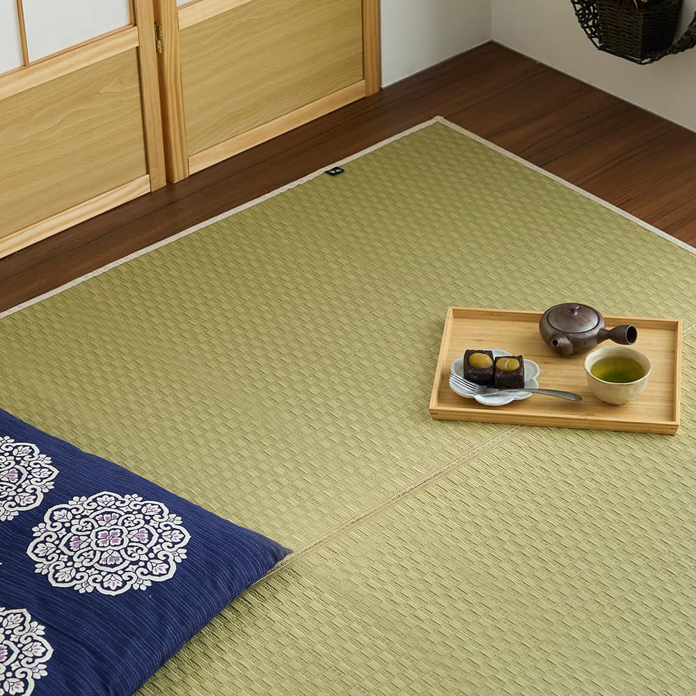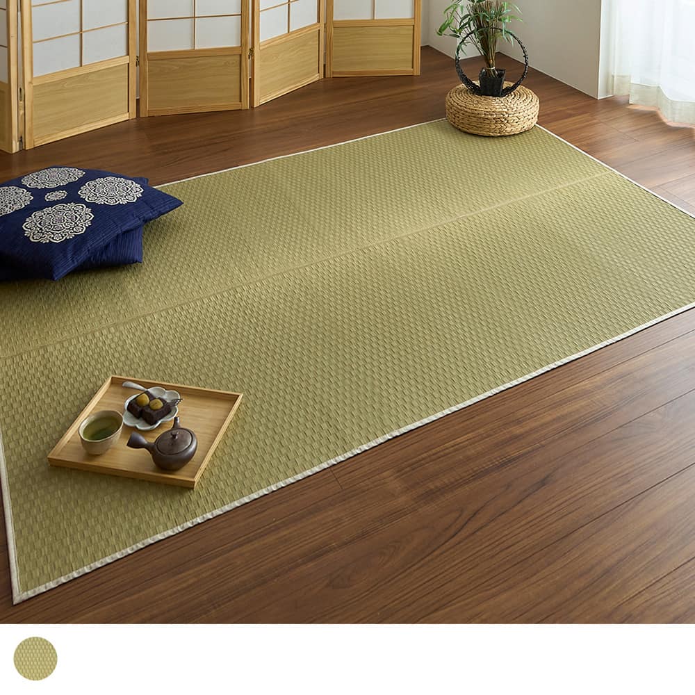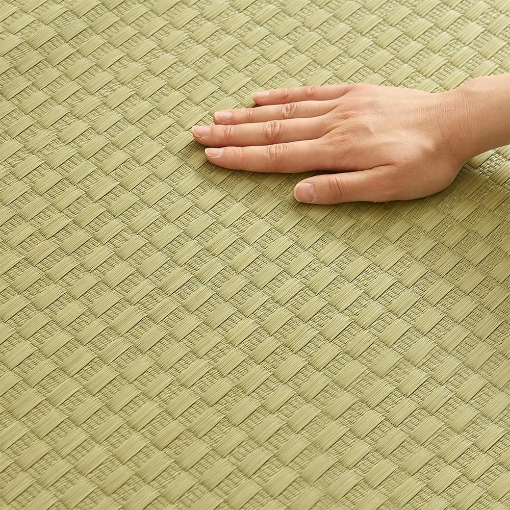 い草には空気の自然浄化作用、湿度の調節作用などがあります。さらに、良質ない草を高密度に織り込んでいるので、高い耐久性と素足に心地よいクッション性が保たれます。使用するうちに黄金色に変化する味わいも自然素材ならではの魅力です。