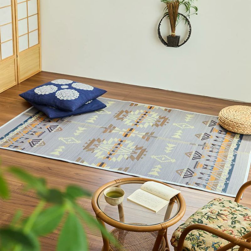 アウトドアなムード漂う「キリム柄」の中でも、キレイめのものを探しているなら、柄のサイズ感とカラーリングが上品な「ラマンタ」はいかがでしょうか?い草のもつ天然素材の風合いや機能はそのままに、デザインをスタイルアップ!キャンプよりもちょっと贅沢なグランピングにぴったりな、スタイリッシュい草ラグです。