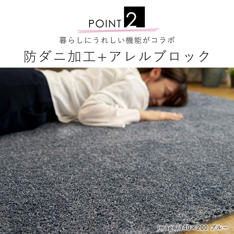 ダニを寄せ付けない忌避効果を高め、持続性に優れた「防ダニ加工」とアレルギーの原因となる物質であるアレルゲンを吸着し、働きを低減させる「アレルブロック」を施した、専門家も認める「安心・安全・清潔」なラグ。小さなお子様やアレルギー持ちの方におすすめしたい一枚です。