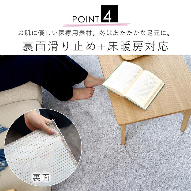 肌に優しい医療用素材を使用した滑り止め加工で安心安全。床暖房やホットカーペットにも対応しているので、床暖房のあるお部屋でも暖かく過ごせます。足元をじんわり温めてくれ、心地よいリラックスタイムを演出してくれます。