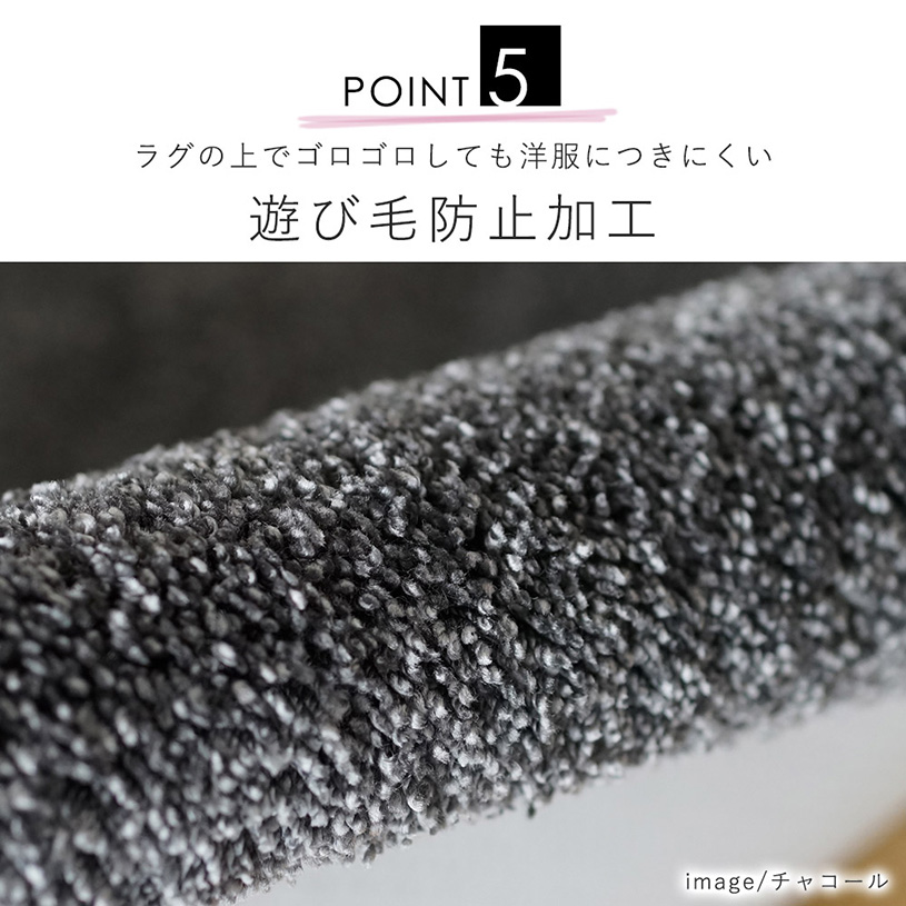 遊び毛や毛玉の発生がしにくい遊び毛防止加工を施しており、毛が舞いにいにくく特に小さなお子様やペットがいるご家庭におすすめの安心仕様。ラグの上でごろんと寝転んでも衣類につきにくいのも嬉しいポイントです◎