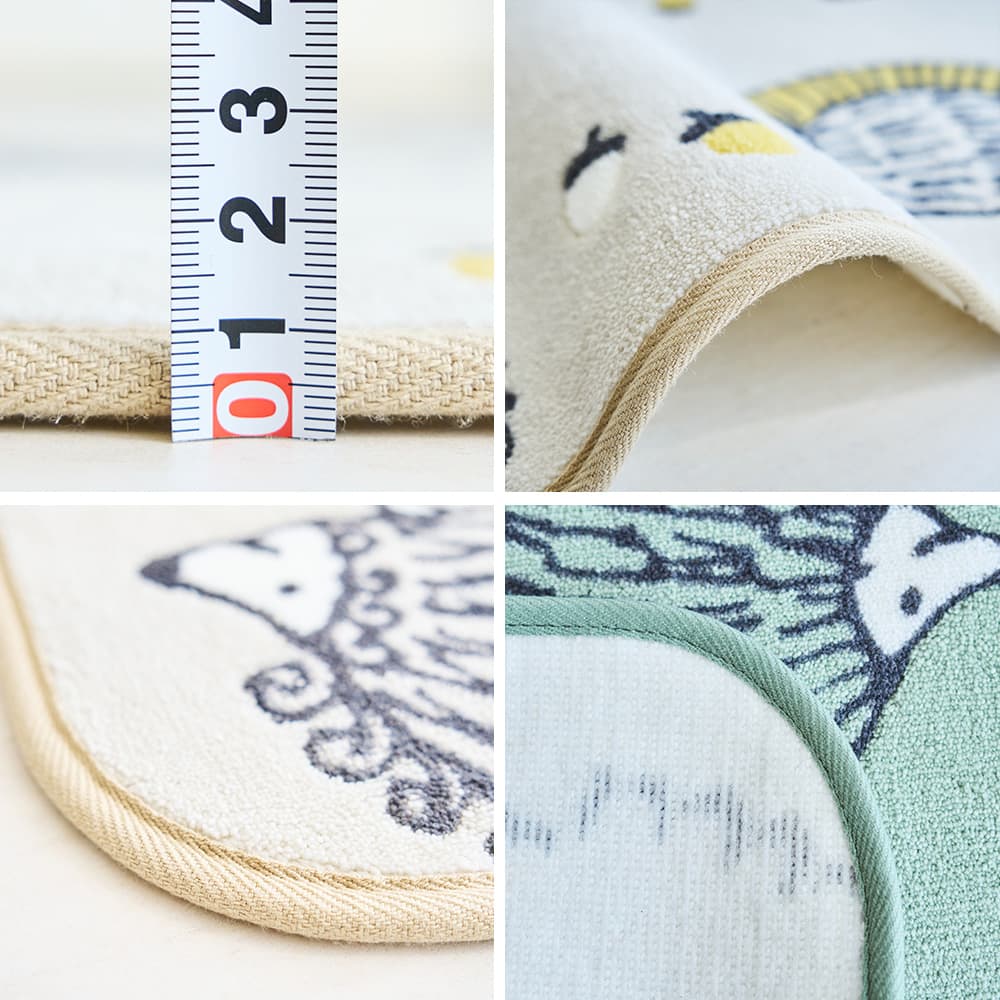 高密度パイルで、しっかりとした踏み心地。端処理には杉綾織のテープを巻いているので、耐久性がよく見た目もスッキリ。バスルームまでキュートに