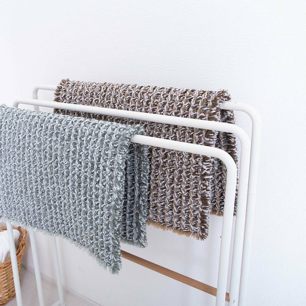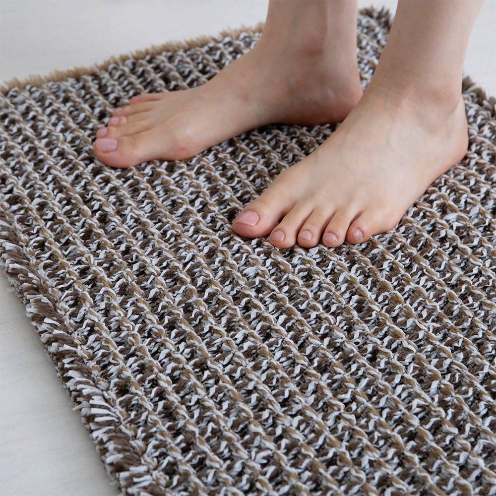 不織布スリット糸の爽やかな肌触りと、ポリエステル糸の優しい肌触りが絶妙に調和した一枚。吸水性にも優れており、お風呂上りの冷えを感じさせない、ふんわりとした踏み心地が病みつきになること間違いなし◎