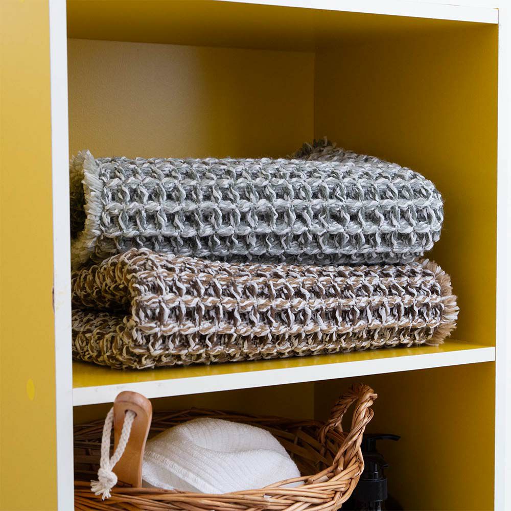 程よい厚みで、折りたたんでコンパクトに収納できるため、スペースを取らず、洗面所の棚やクローゼットなど様々な場所にすっきり収まり、軽くて扱いやすいのも魅力の一つ。収納に困ることもなく、いつでも清潔な状態を保てます。