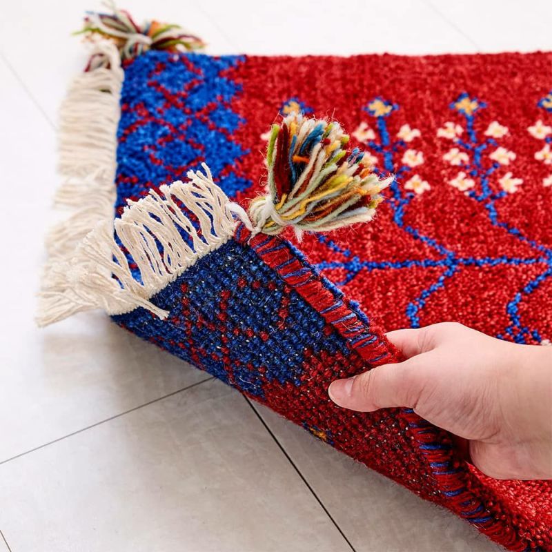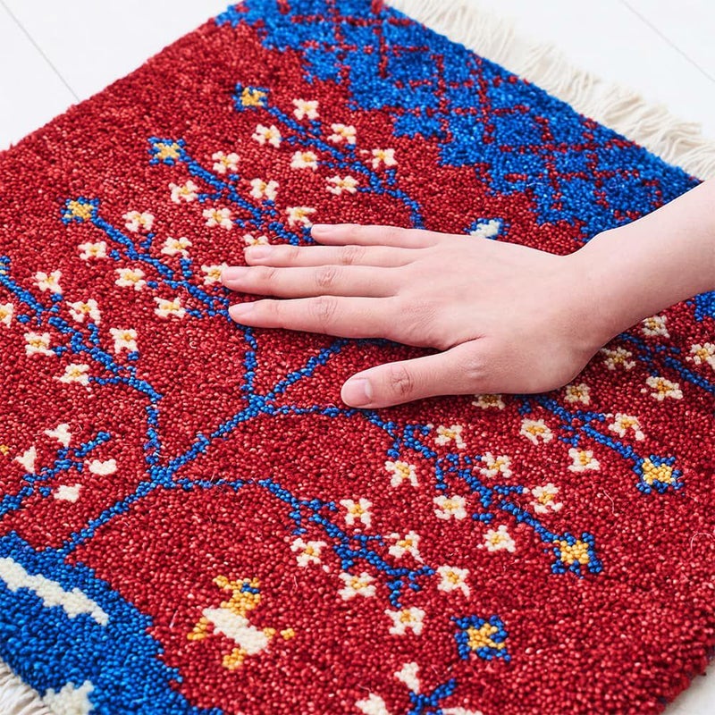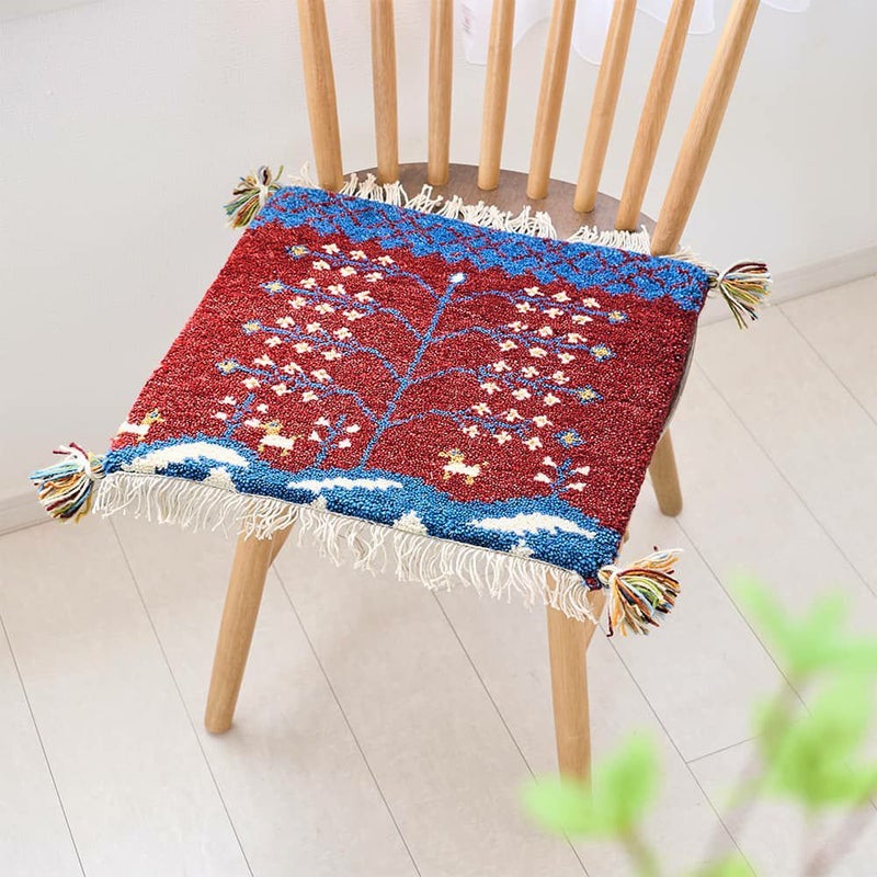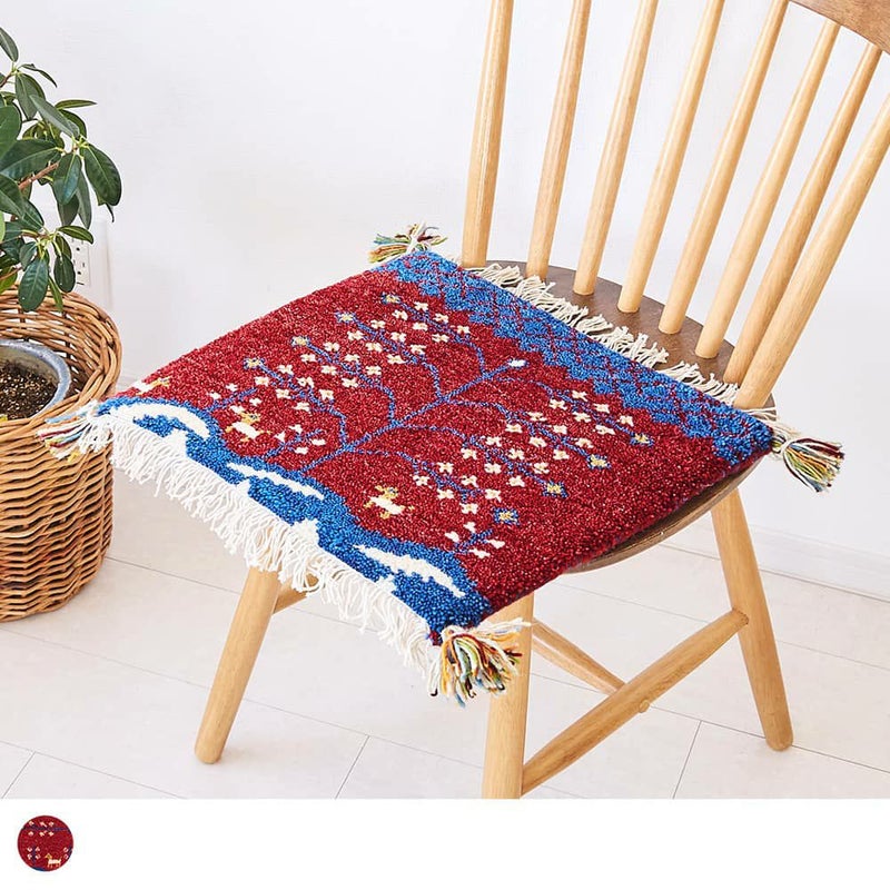 柔らかな発色の赤と青のコントラスト、たくさんの花の咲いた木の柄が印象的なギャッベ。穏やかで過ごしやすい春へのあこがれの念や自然への感謝を表現した手織りのチェアパッドをご紹介します。