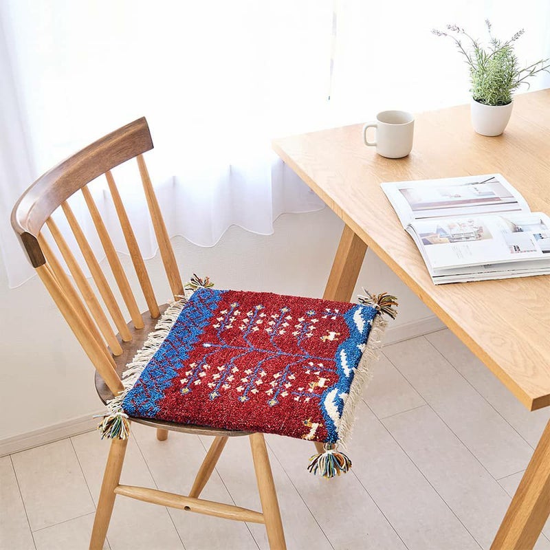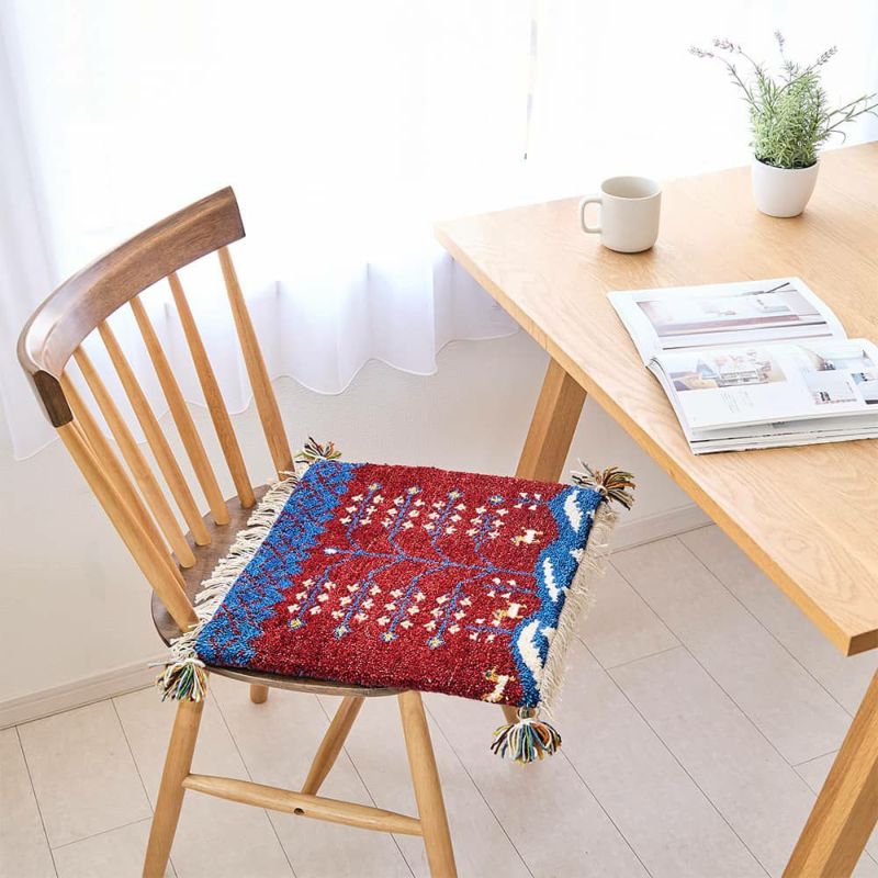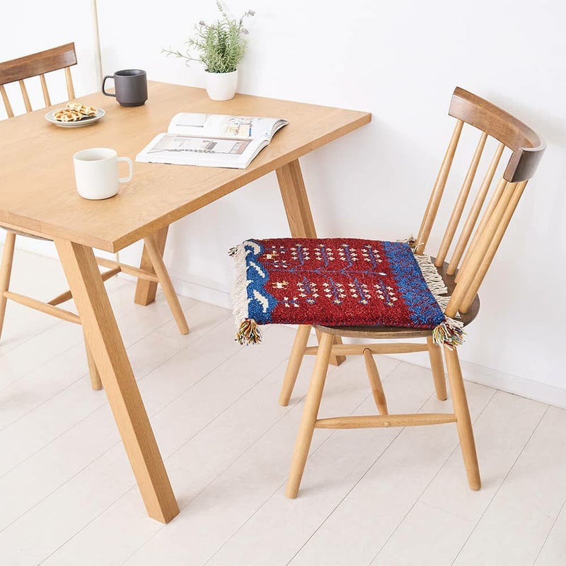 手間暇かけて作られるギャッベのチェアパッドは、へたりにくく耐久性も抜群。サイドのフリンジとタッセルも可愛らしく、細部までこだわりを感じられます。長く大切にしていきたくなるような、愛着の湧く1枚です。