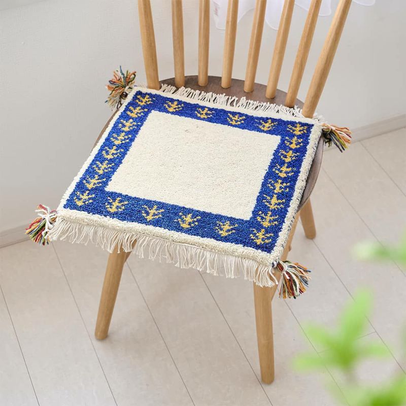 手間暇かけて作られるギャッベのチェアパッドは、へたりにくく耐久性も抜群。サイドのフリンジとタッセルも可愛らしく、細部までこだわりを感じられます。長く大切にしていきたくなるような、愛着の湧く1枚です。