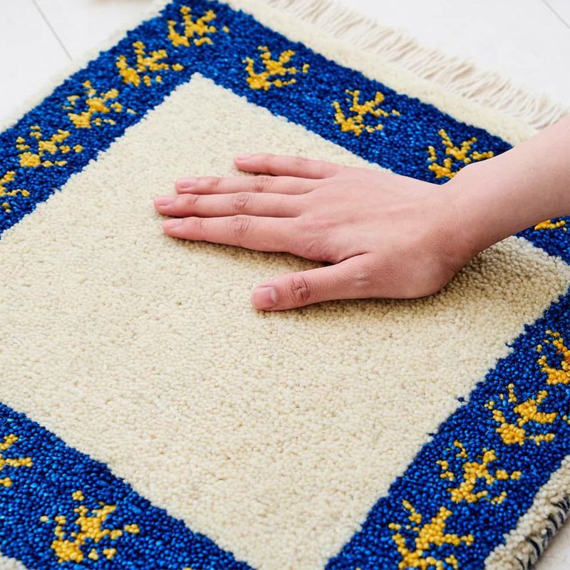 上質なウールとコットンを贅沢に使用して手織りで編み上げたギャッベの玄関マット。シンプルなデザインにカラフルなタッセルでアクセントをプラス。青い縁取りには伝統的な文様の「生命の木」が描かれ、長寿と繁栄の祈りが込められています。