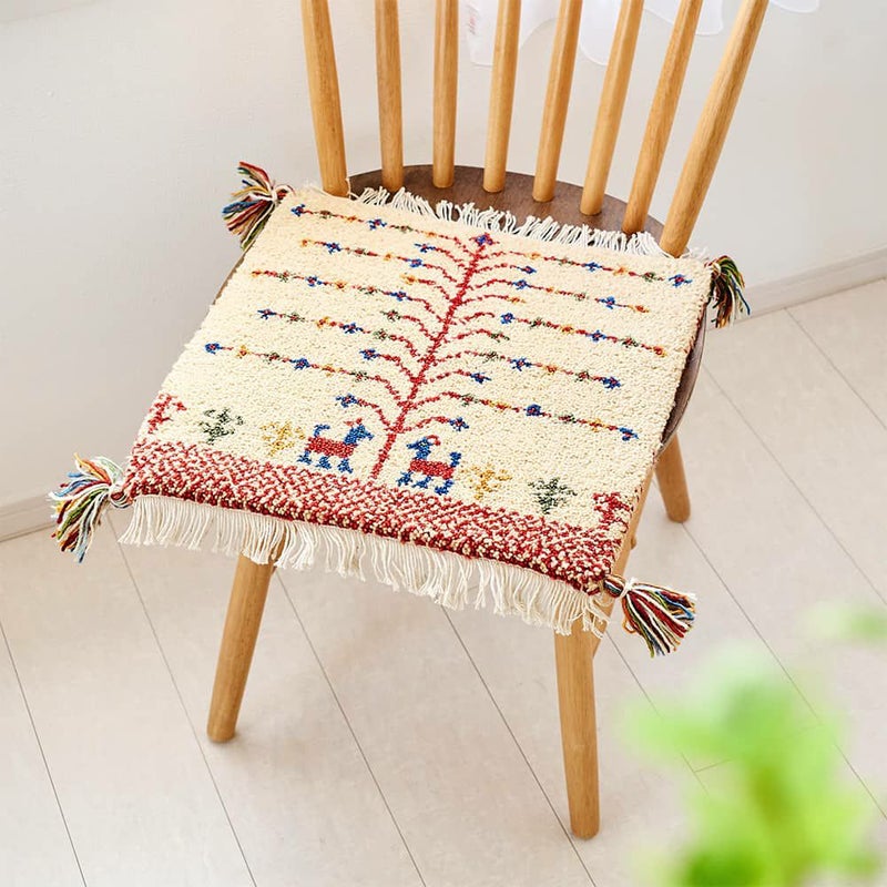 遊牧民の生活に根ざしたギャッベの伝統的なモチーフには、感謝の気持ちや願いが込められています。大きな木に集う2頭の山羊が描かれた、素朴であたたかなデザインのチェアパッドをご紹介します。
