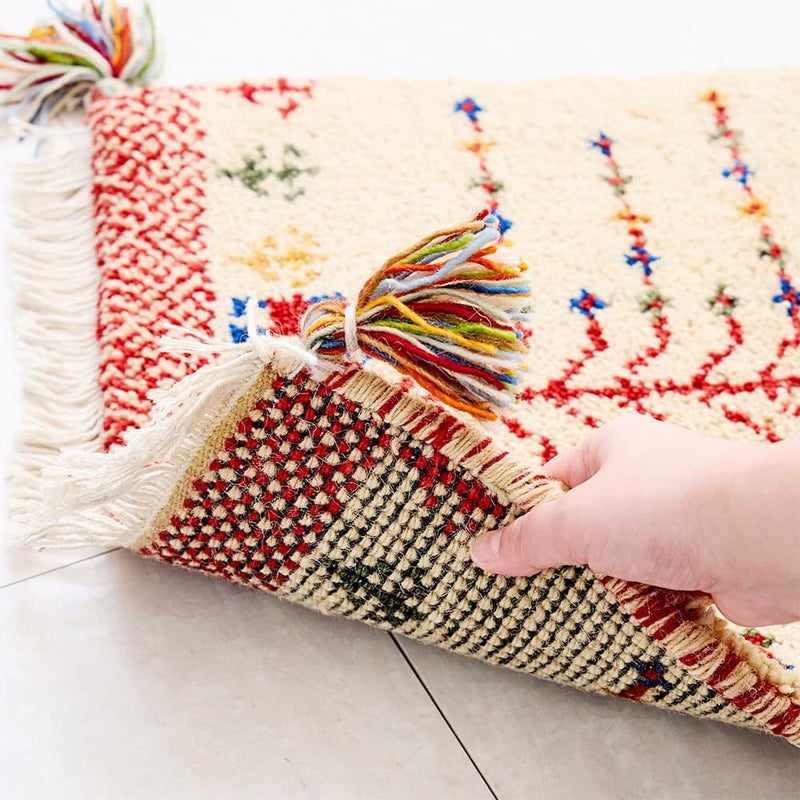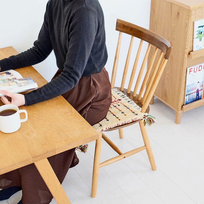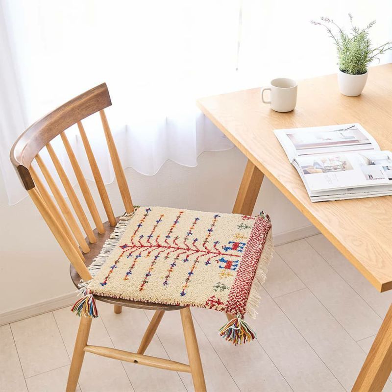 手間暇かけて作られるギャッベのチェアパッドは、へたりにくく耐久性も抜群。サイドのフリンジとタッセルも可愛らしく、細部までこだわりを感じられます。長く大切にしていきたくなるような、愛着の湧く1枚です。