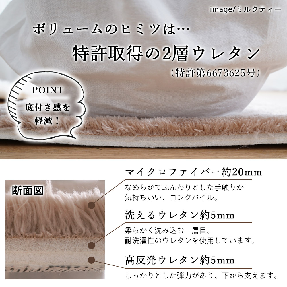 ふわふわの手触りと、底の固さを感じないしっかりとした厚み。さらに汚れたらすぐに洗えるウォッシャブル機能付き!使用感も機能性にもこだわりが詰まった1枚です。