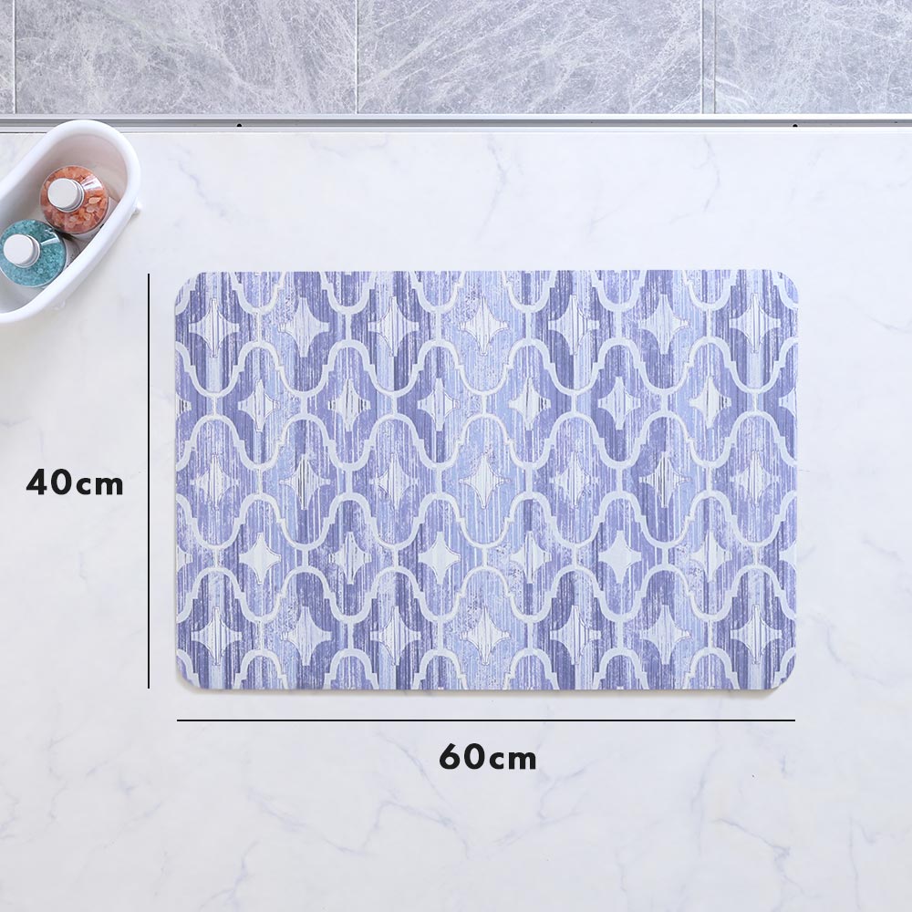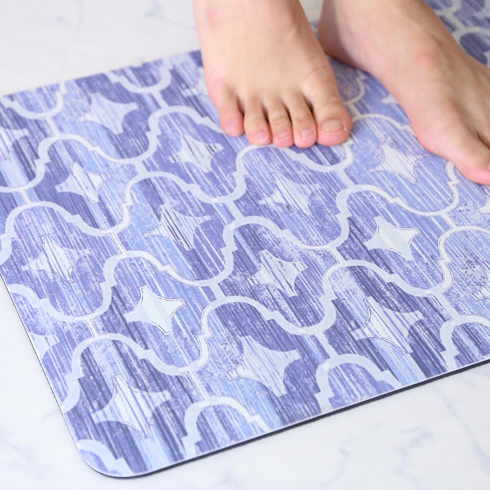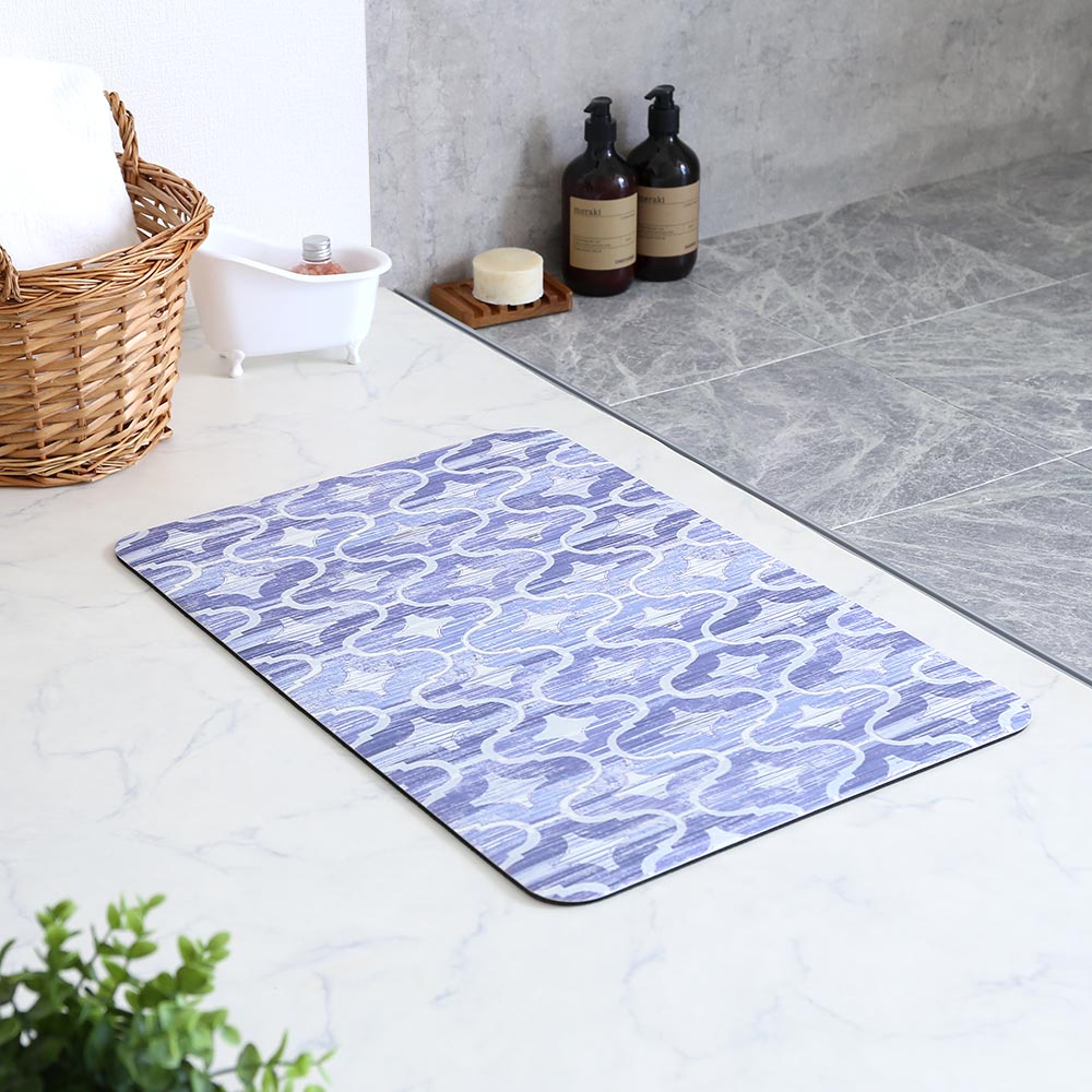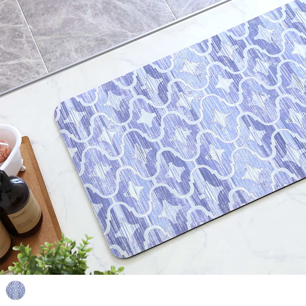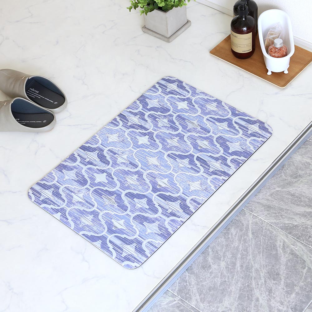 インテリアでも人気のモロッカンタイル柄のバスマット。 珪藻土パウダーを配合した素材により、「デザイン性」「吸水性」「踏みごこち」の3つを叶えるソフトな珪藻土バスマットです。