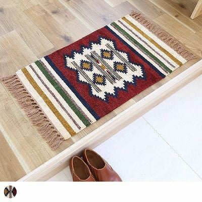 カジュアルさとエスニックさのバランスが丁度よく、ご家庭に取り入れやすいキリムの玄関マット。独自の色彩と文様が特徴で、ファンを多く持つ織りものです。
