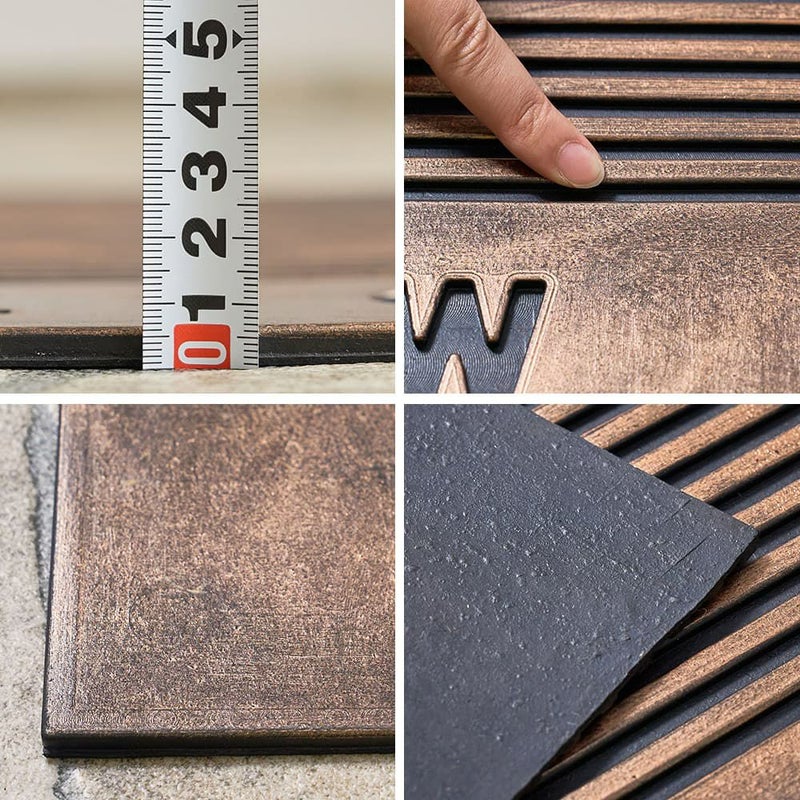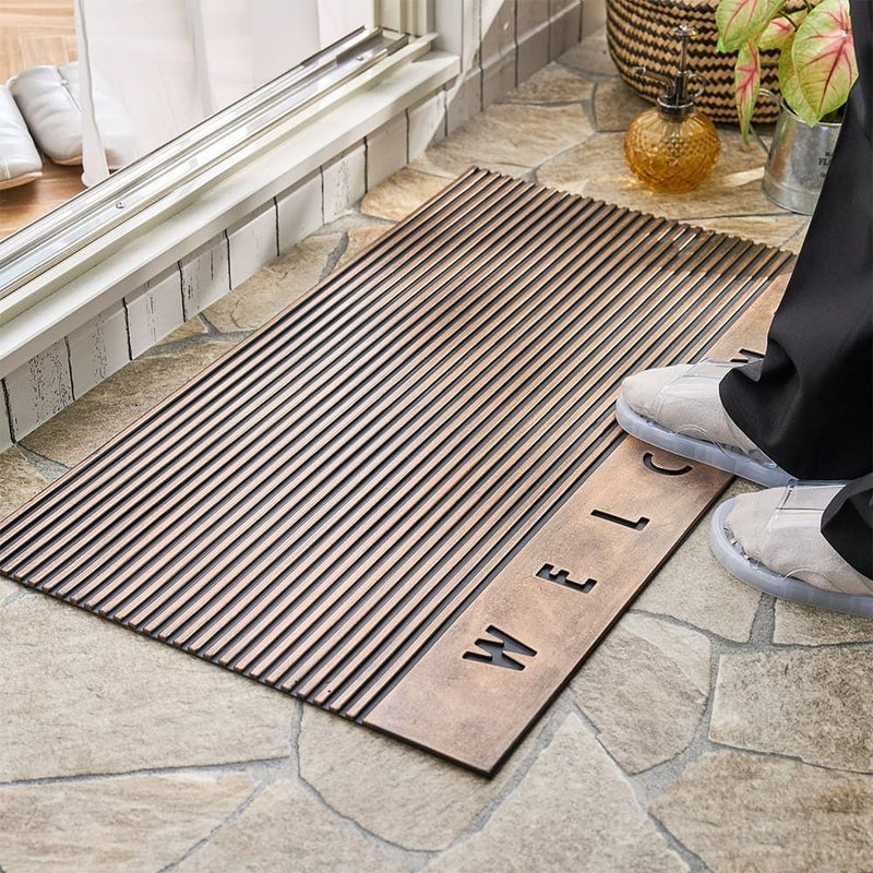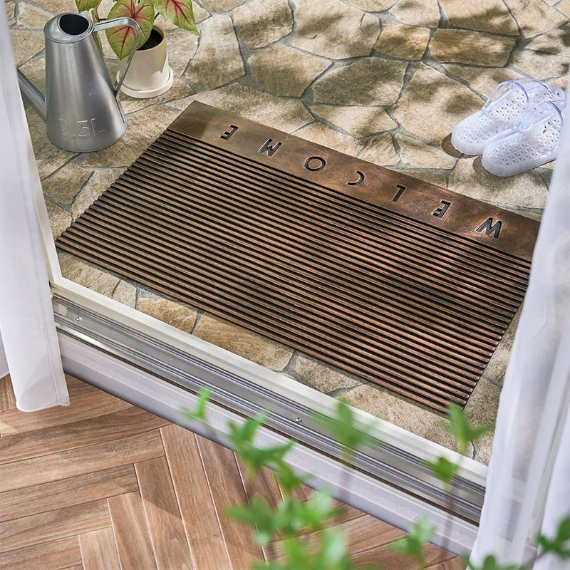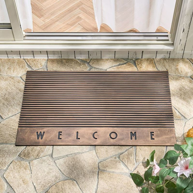ゴム素材とは思えない重厚感のある仕上がりが魅力的な屋外用マット。真鍮を思わせるアンティーク調の質感で、空間を一気に洗練された雰囲気ににまとめ上げてくれること間違いなしです。