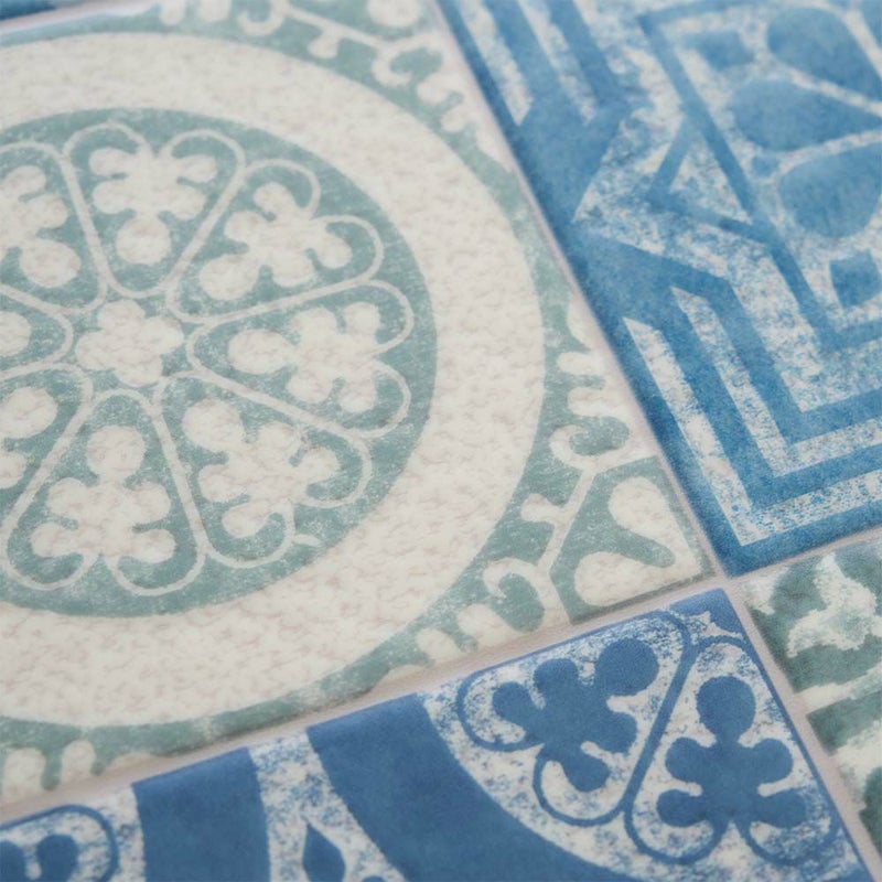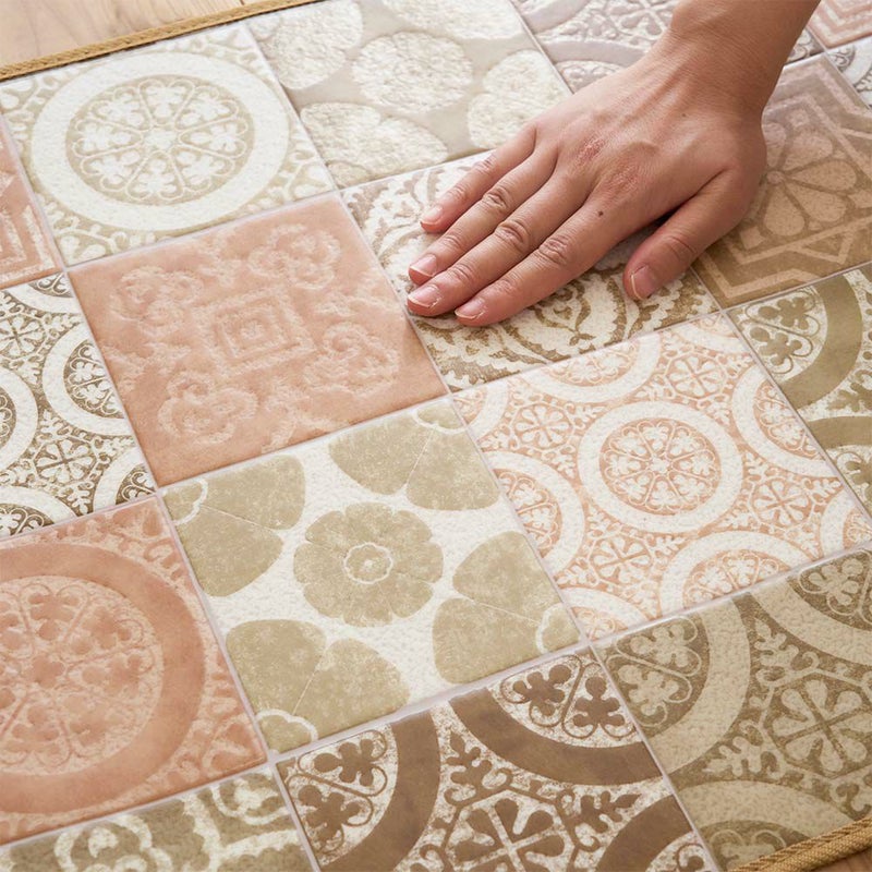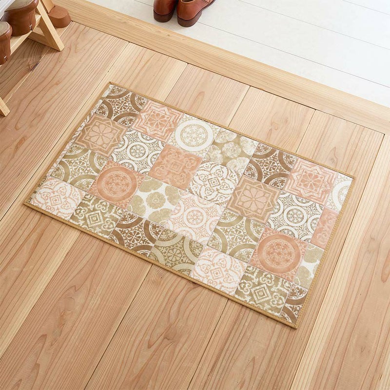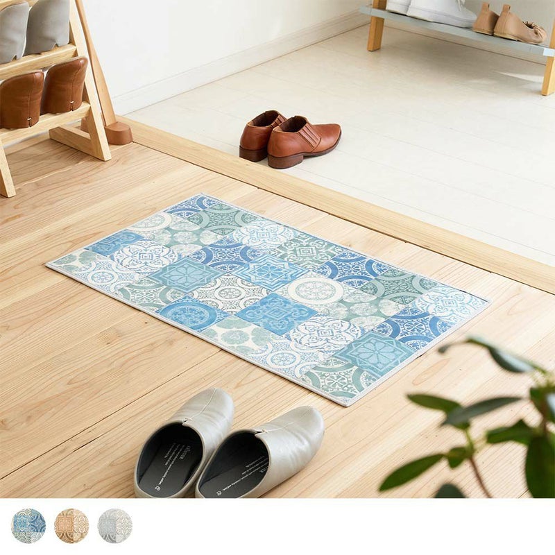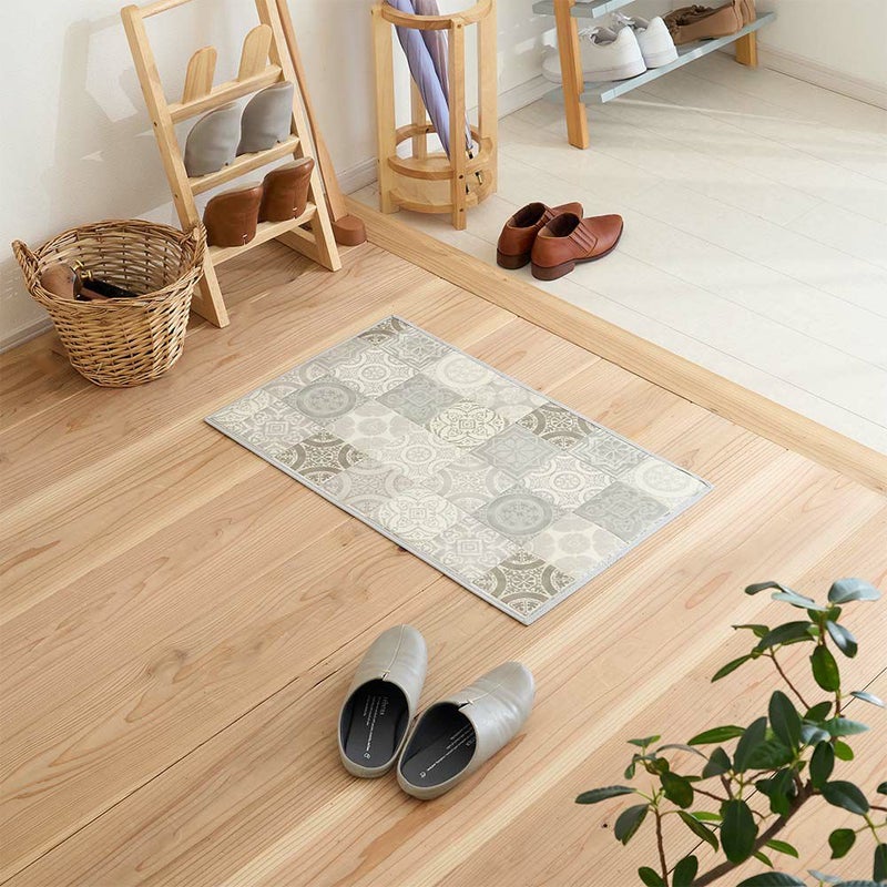 アンティークタイルのようなレトロなデザインの玄関マット。水に強いPVC素材で水拭きも可能だから、人通りが多く汚れの気になる玄関でも安心してお使いいただけます。同系色でまとめられた異なる柄のタイルは、個性が光るデザインながら幅広いインテリアとマッチしてくれる一枚です。