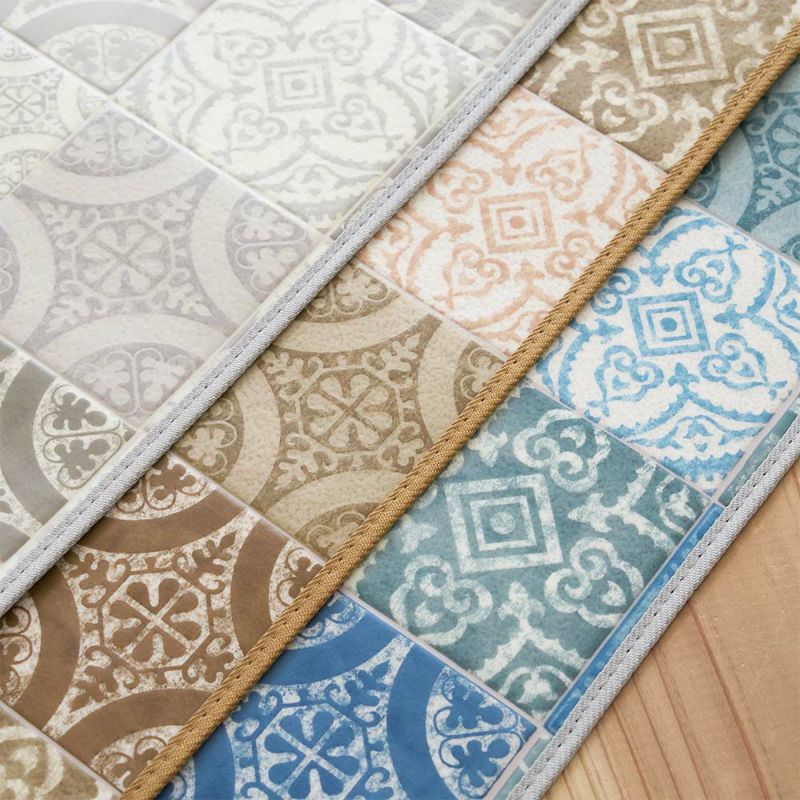 異なる幾何学柄のタイルを敷き詰めたようなデザインがレトロな雰囲気ただよう「アンティグオ」。国産マットならではの、痒い所に手が届く抜群の機能性とデザイン性を両立させた一枚です。あなたの理想の暮らしを魔法のように叶えてくれるマットを、納得の一枚としてチョイスしませんか?