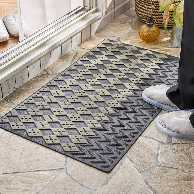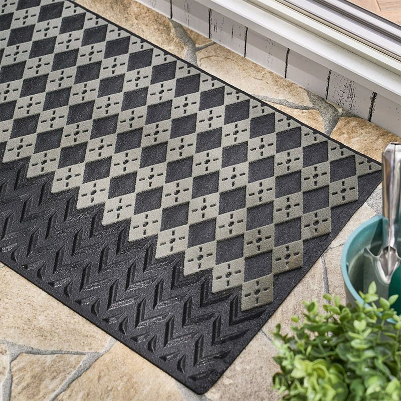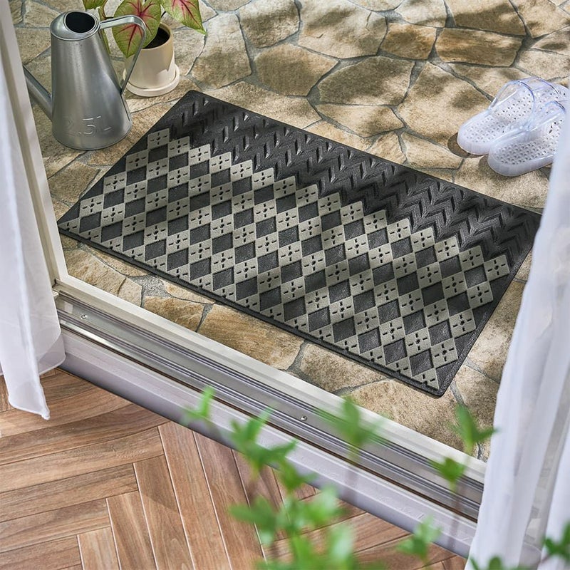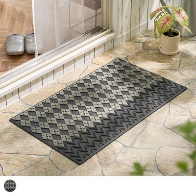 手前のラバー部分と奥のパイル部分。2ステップで無駄なく汚れをキャッチしてくれる屋外用マット。パイル部分の凹凸は細やかなアーガイル模様になっており、しっかりと汚れを落とすことを考え抜かれたデザインが、機能美を感じさせる一枚です。