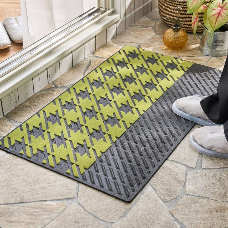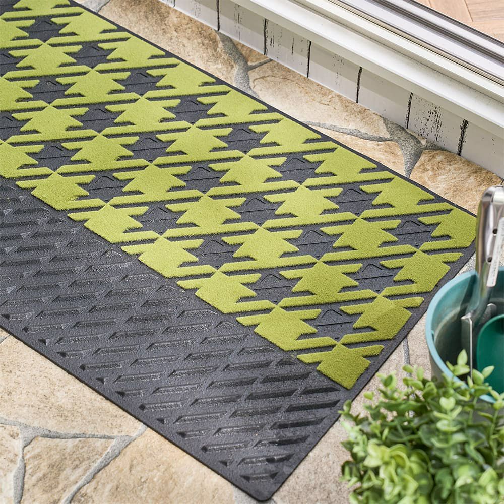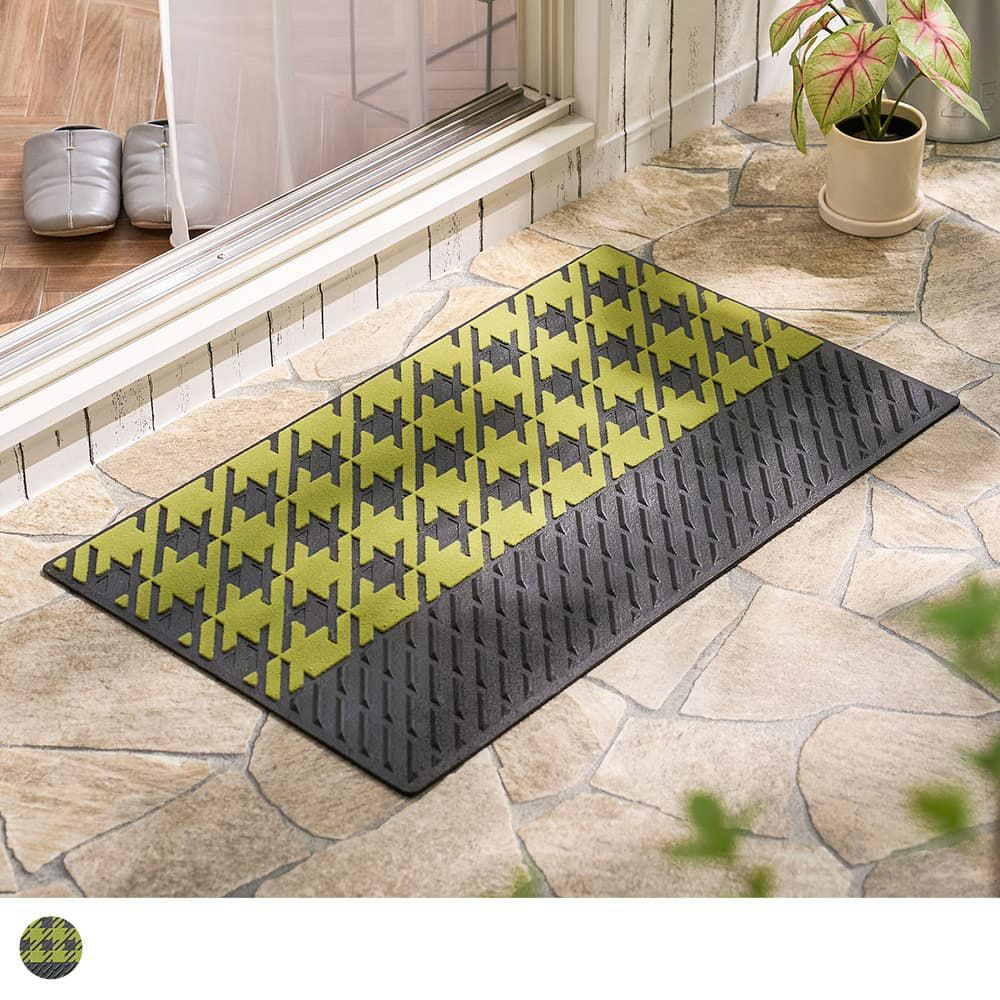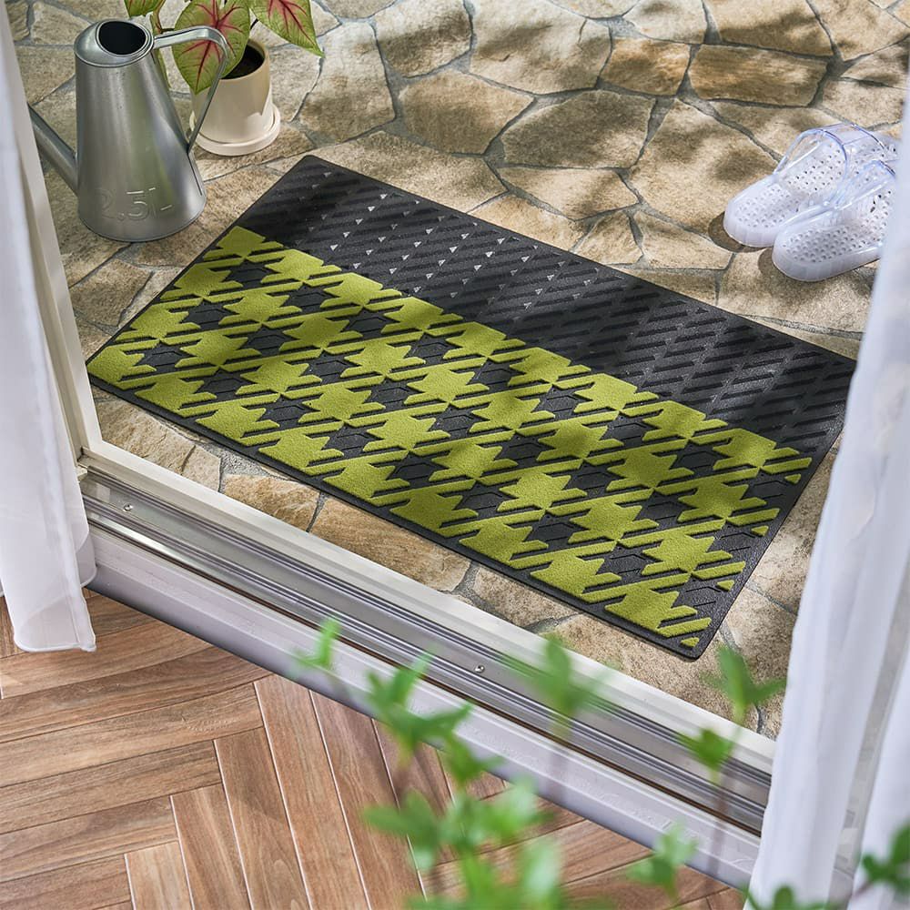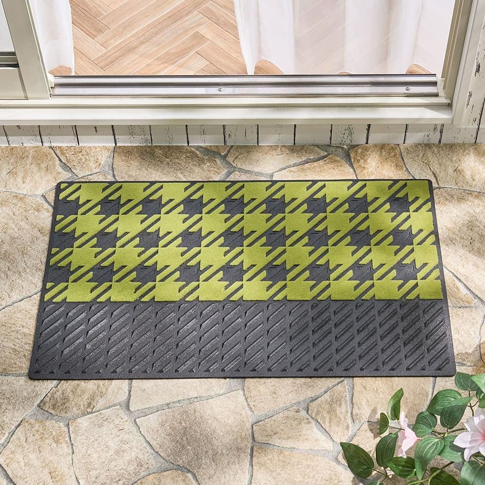 鮮やかなライトグリーンと千鳥格子柄が、心まで明るくしてくれる屋外用のエントランスマット。機能性はもちろん大切だけど、毎日目にするものだからやっぱり可愛くなくちゃ!そんなあなたに贈りたいこだわりの一枚です。