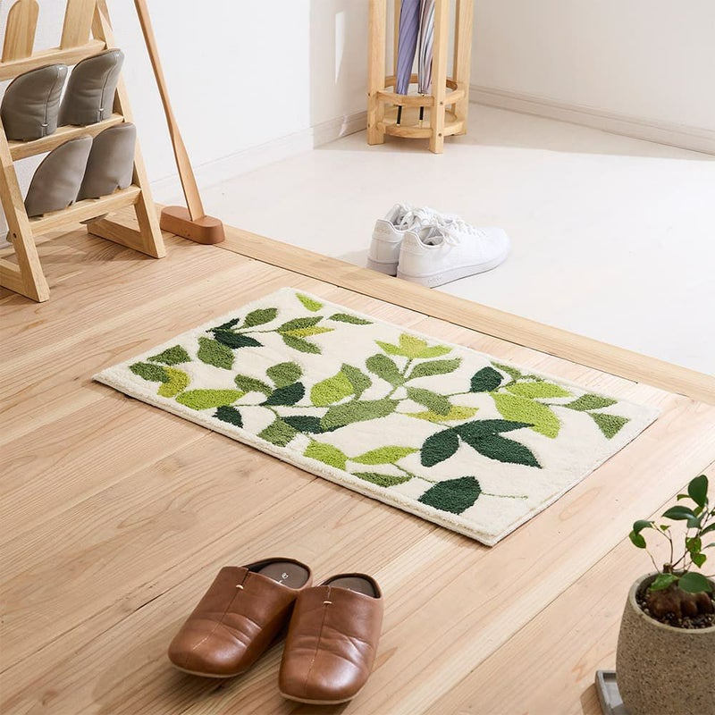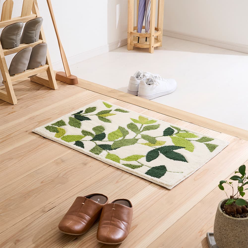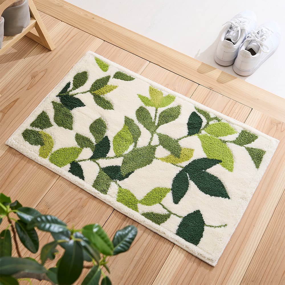 敷くだけで爽やかな風を感じられそうな、瑞々しいリーフデザインの玄関マット。幅広いテイストに馴染むナチュラルデザインで空間に彩りをプラスしてくれる一枚です。