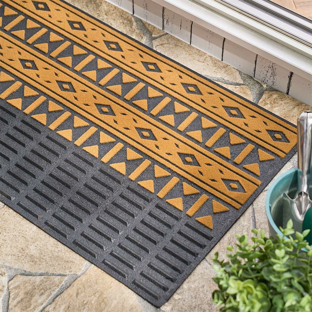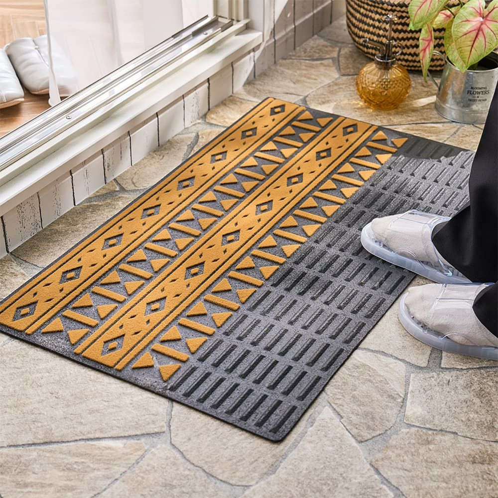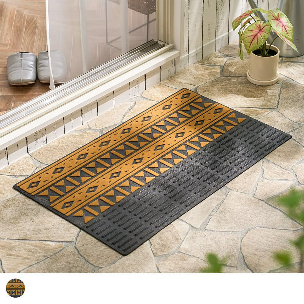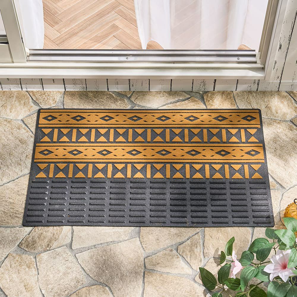空間をぱっと明るくしてくれるネイティブ柄の屋外用マット。手前はラバー素材・奥はパイル素材と2ステップで無駄なく汚れをキャッチしてくれます。パイル部分の凹凸が泥汚れやほこりをしっかり掻き出してくれる形状で、デザイン性と実用性が両立した理想的な一枚です。