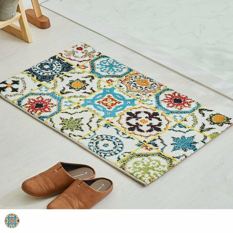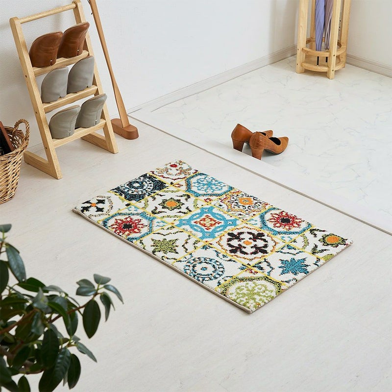 トルコタイルを思わせるカラフルなデザインがかわいい、ウィルトン織りの玄関マット。耐久性に優れたウィルトン織はへたりにくく弾力性があり、長くご愛用いただける一品です。