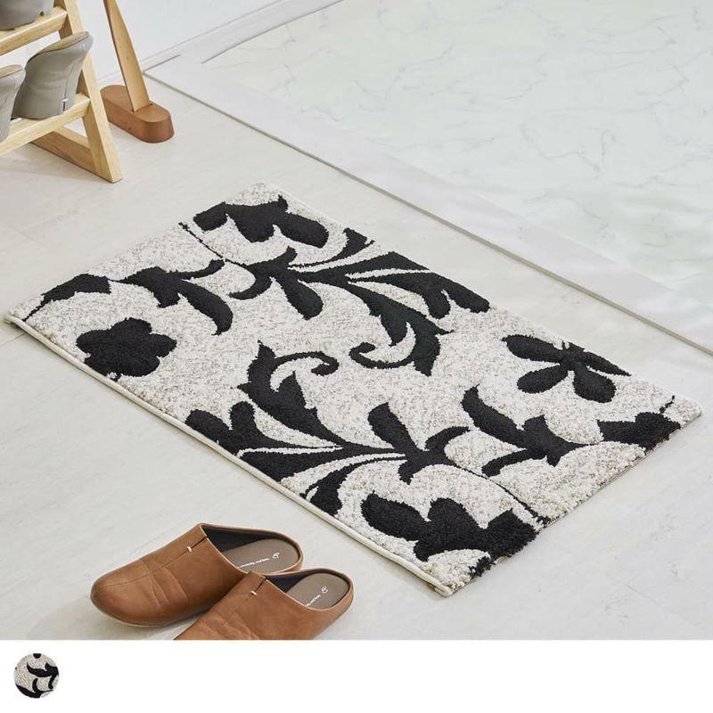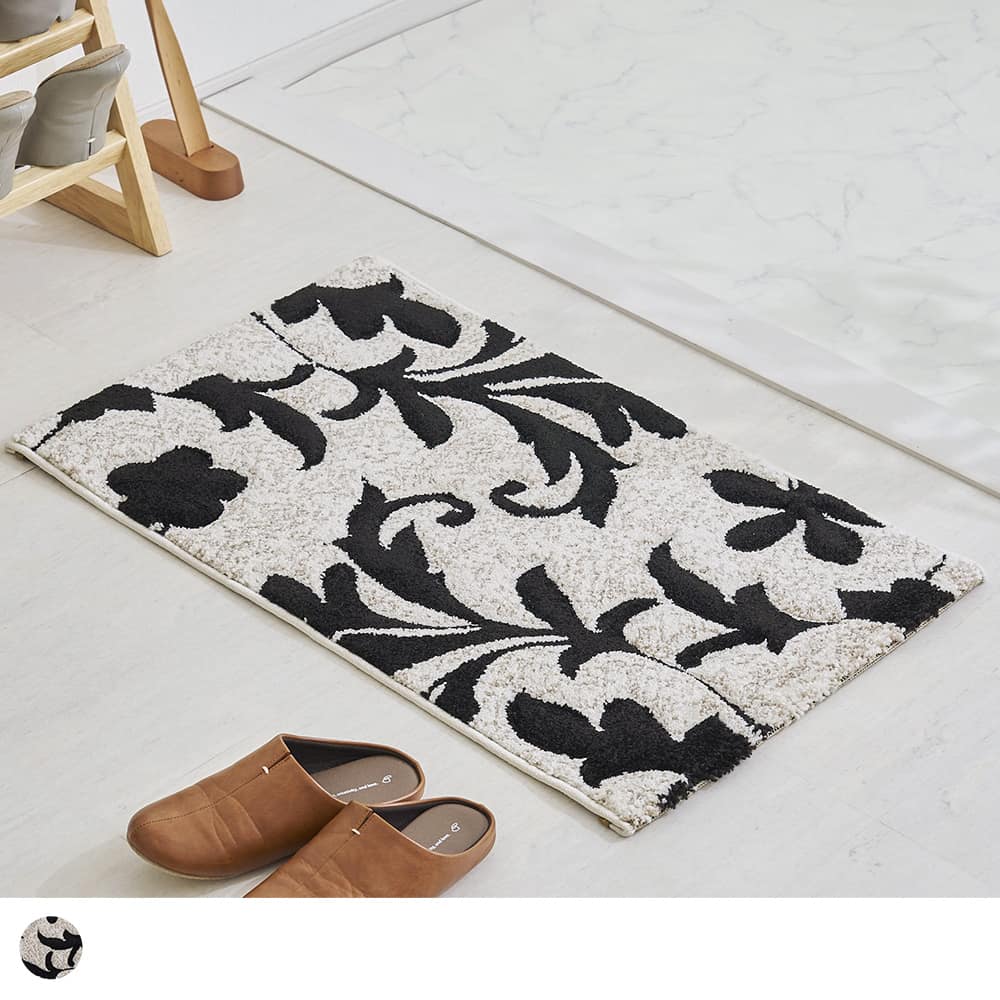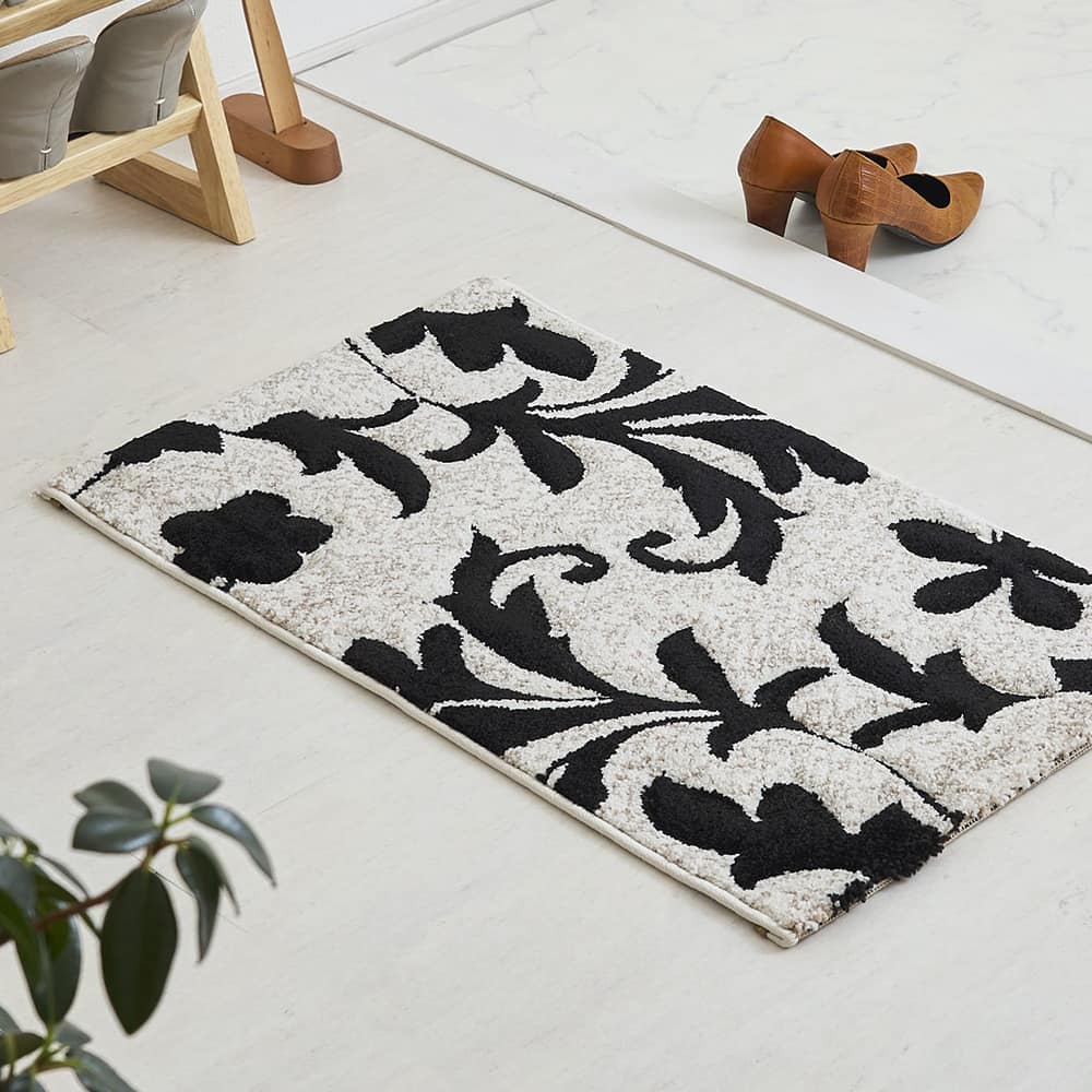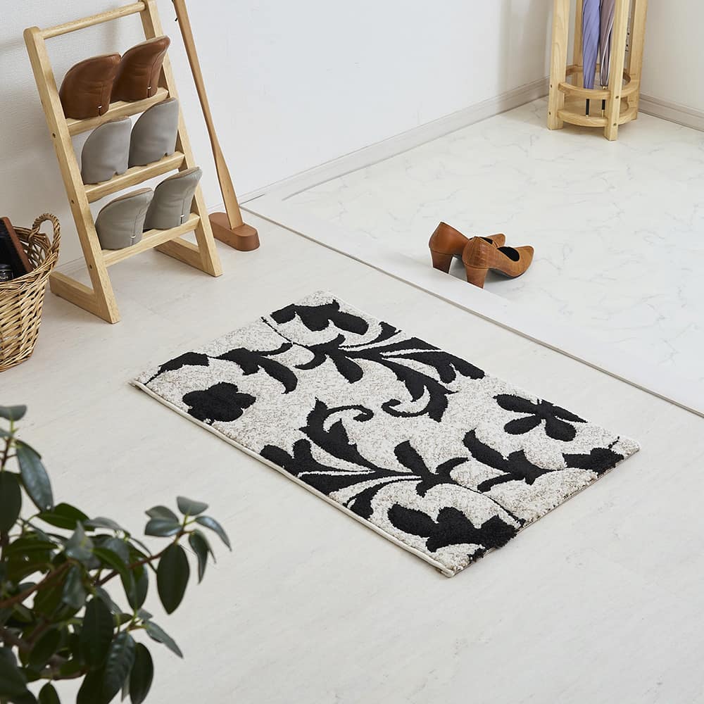 エレガントな蔦花模様をモノトーンで表現した、上品な佇まいの玄関マットです。凹凸感を作り立体的なデザインを作り上げるカービング加工を施しており、ホワイト系のラグジュアリーなテイストはもちろん、幅広いインテリアを格式高くまとめてくれる一枚に仕上げました。