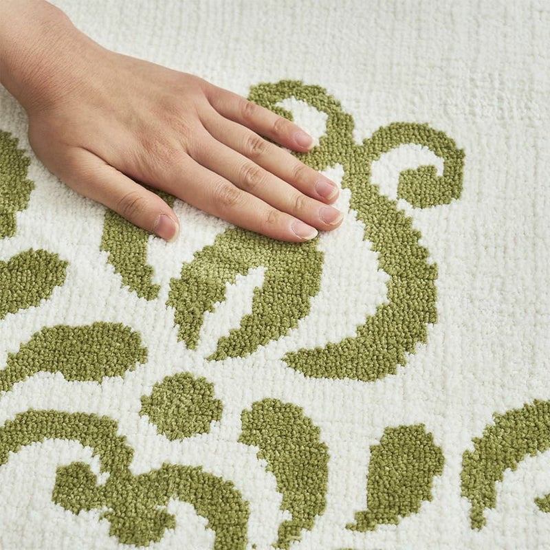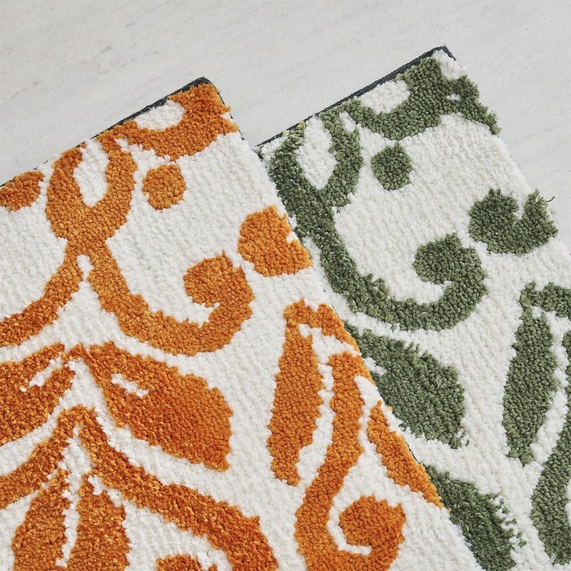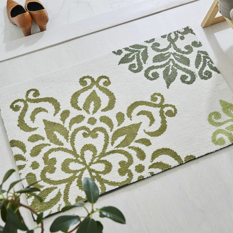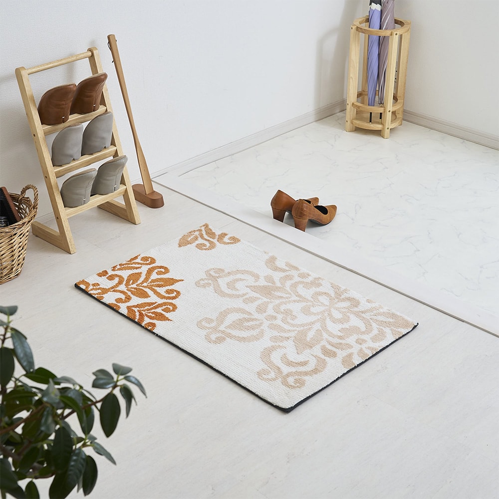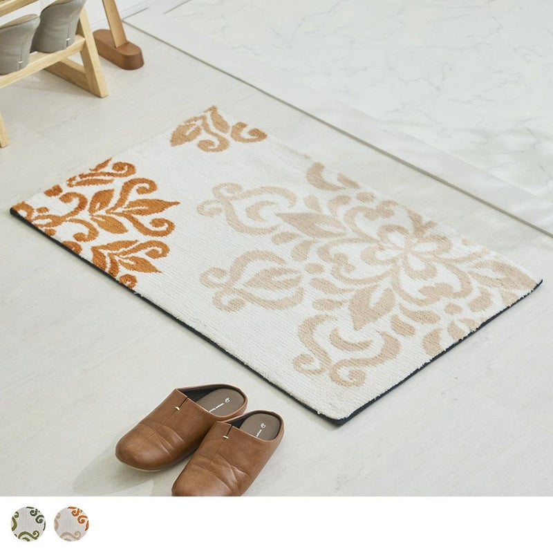 抽象化したクラシカルな花のデザインが上品な佇まいの玄関マット。敷くだけでパッと空間が華やぐ大胆なパターンと、同系色でまとめたシンプルな配色がほどよくマッチした一枚です。