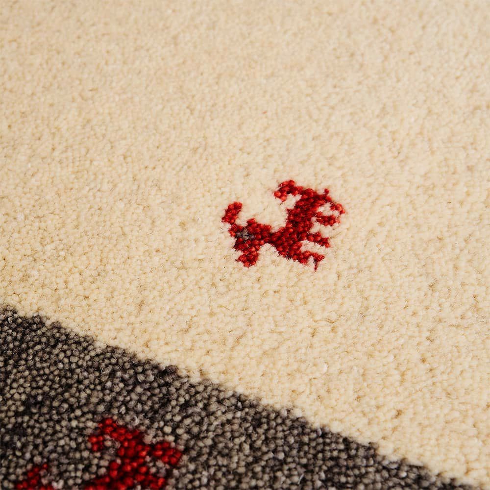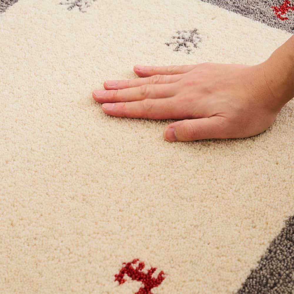 優しいアイボリーにアイスグレー、くすんだ差し色のオレンジが北欧テイストや木目調、ナチュラルなインテリアと合わせるのにぴったり!素朴で暖かなギャッベ柄の魅力を、オシャレに取り入れられる1枚です。