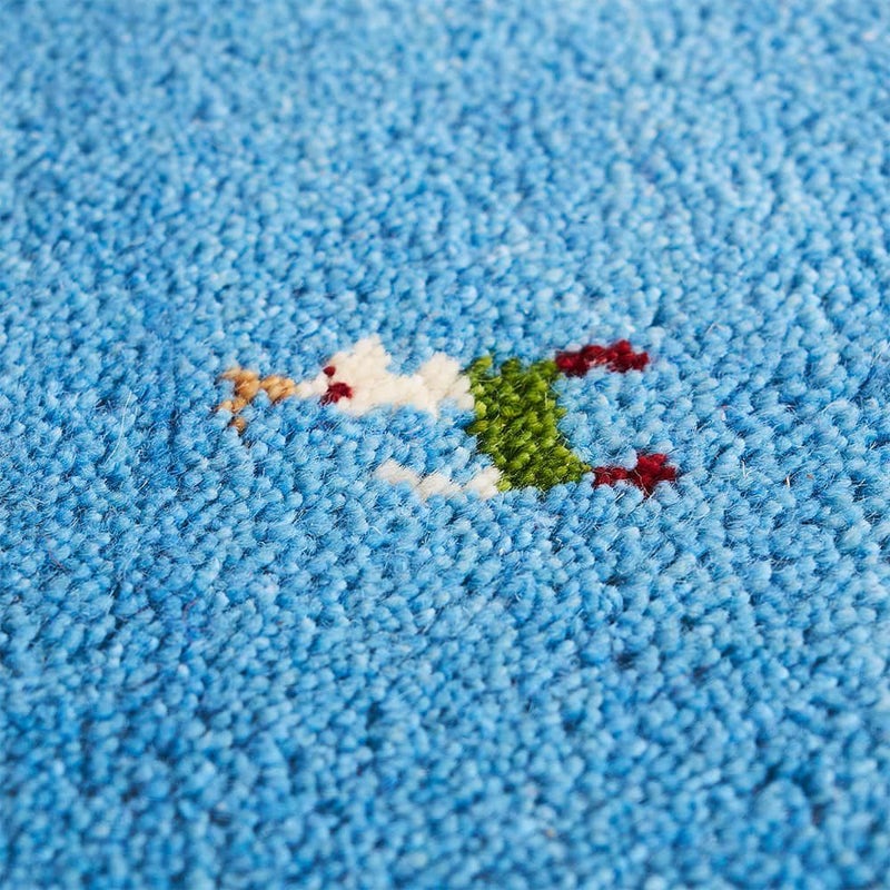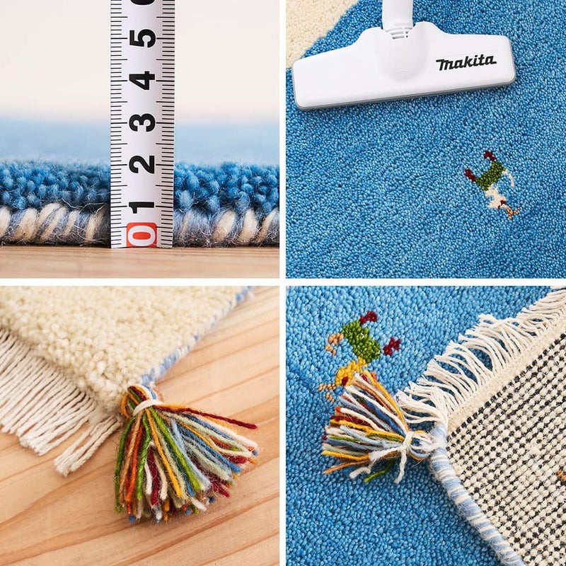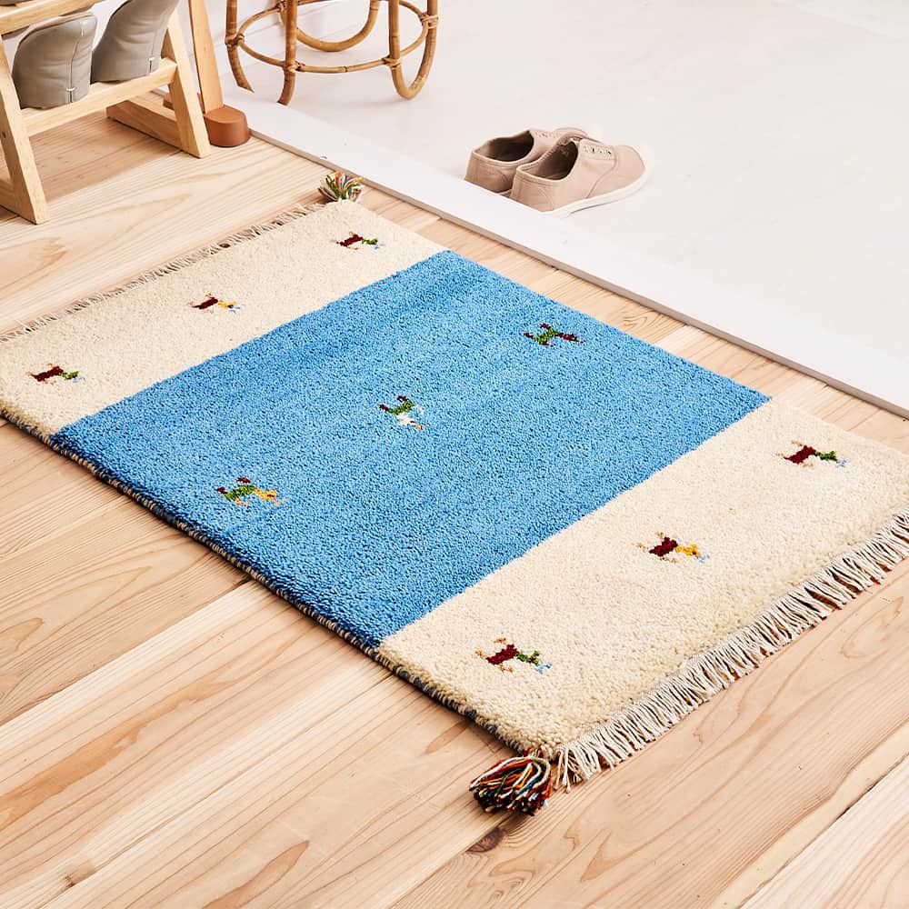 遊牧民の生活を支える山羊は、豊かさや不自由のない生活を祈ったギャッベの伝統的なモチーフ。青空のように爽やかなブルーの生地に配置された山羊には、手織りならではのゆらぎがあり、一匹ごとに個性が溢れます。