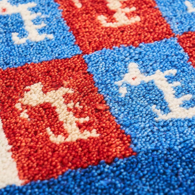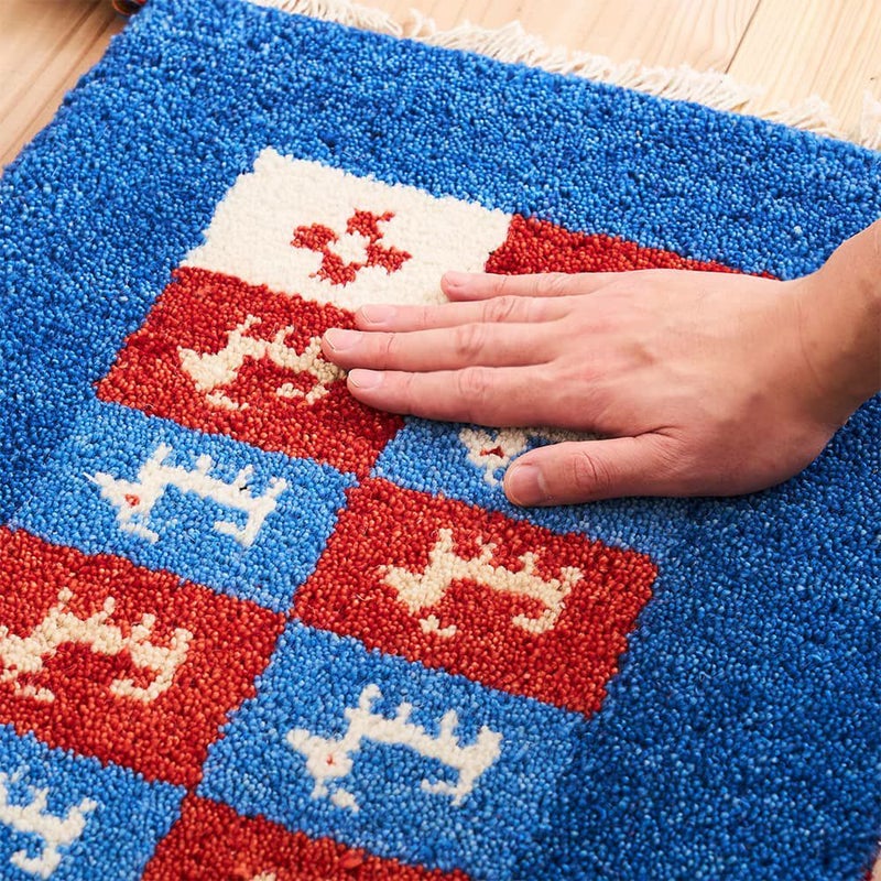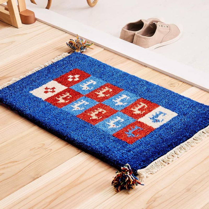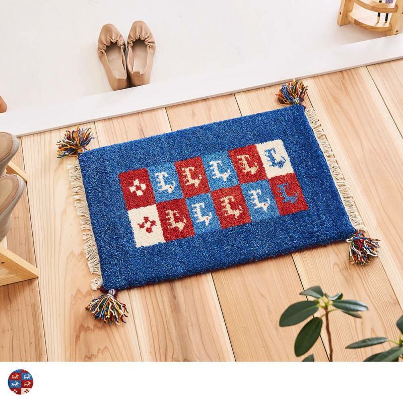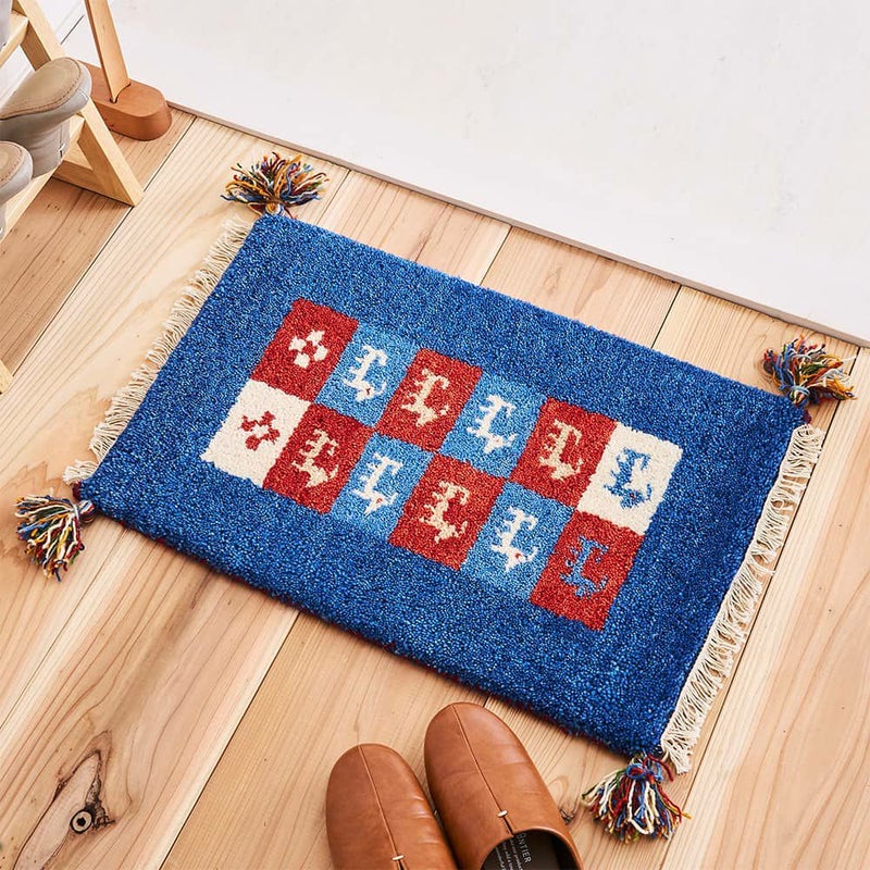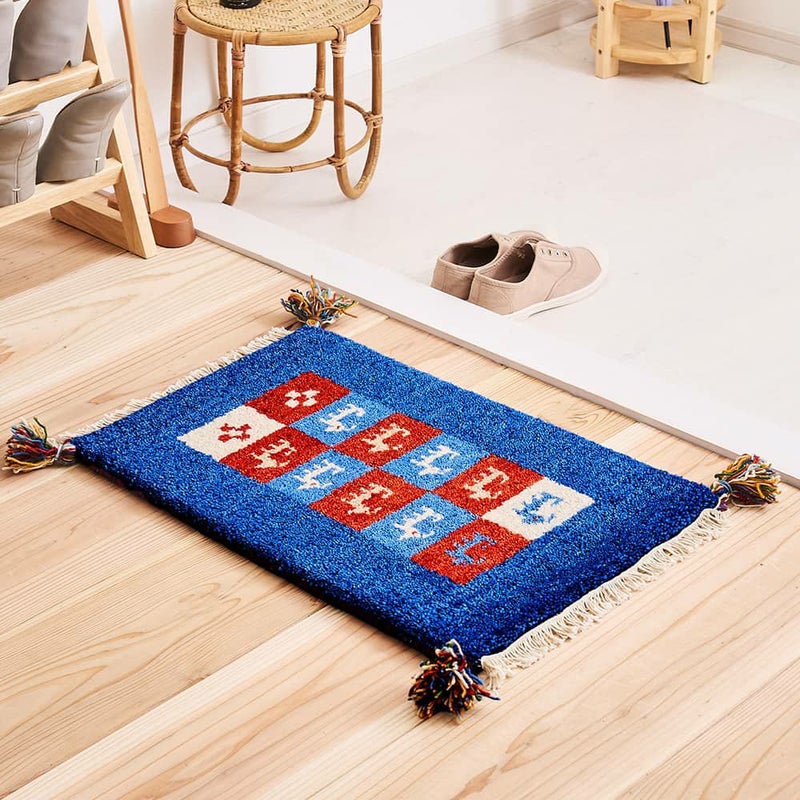 タイルのように並んだ山羊と花のモチーフが愛らしい、ギャッベの玄関マット。手織りならではのゆらぎや個性が一匹ごとにある素朴な風合いをお楽しみください。