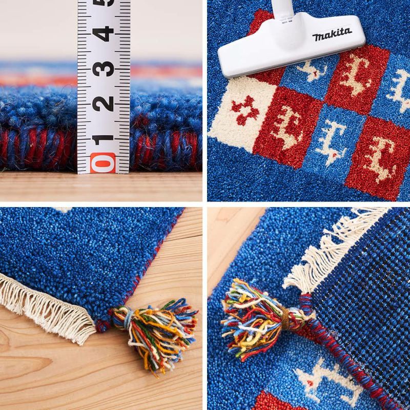 ウールをざっくりと織り、ギャッベならではの贅沢な厚みと独特な弾力にきっとやみつきになることでしょう。適度な重みがあるのでズレにくく、出入りの多い玄関やお子様のいるご家庭にもおすすめです。