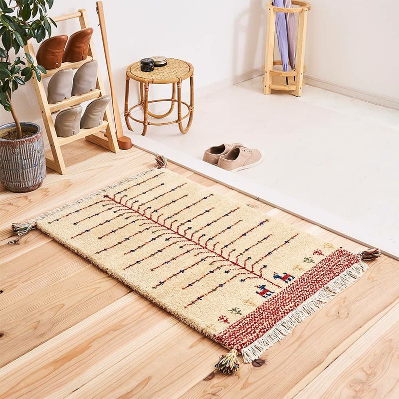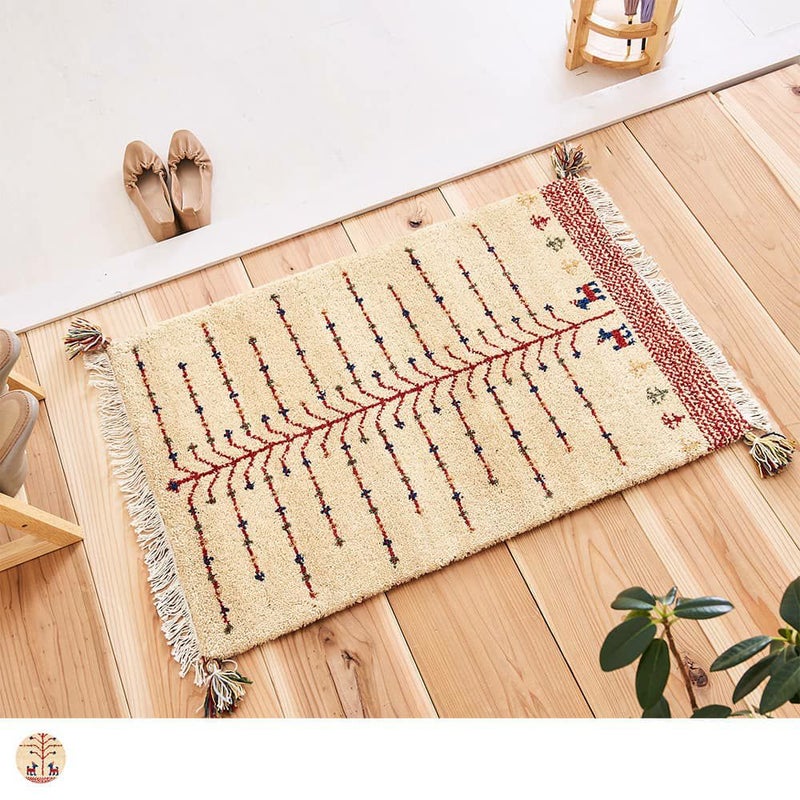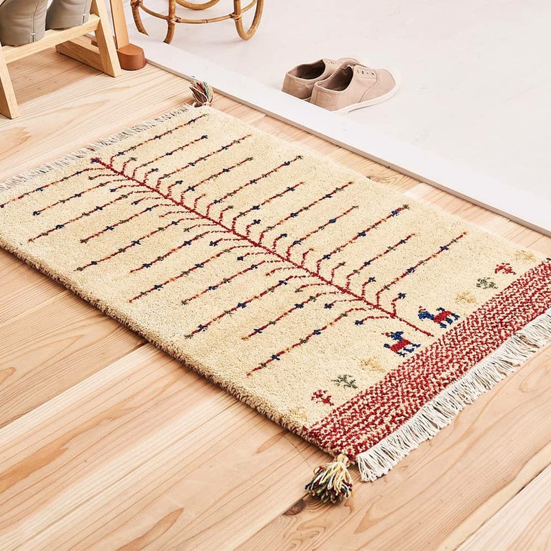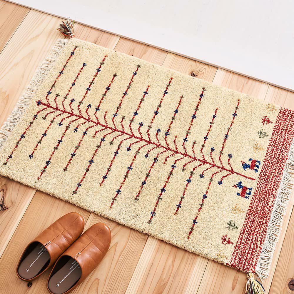遊牧民の生活に根ざした敷物「ギャッベ」の玄関マット。大きな木の下で待ち合わせる2頭のヤギを、ずっと見守っていたくなる愛らしいデザインです。