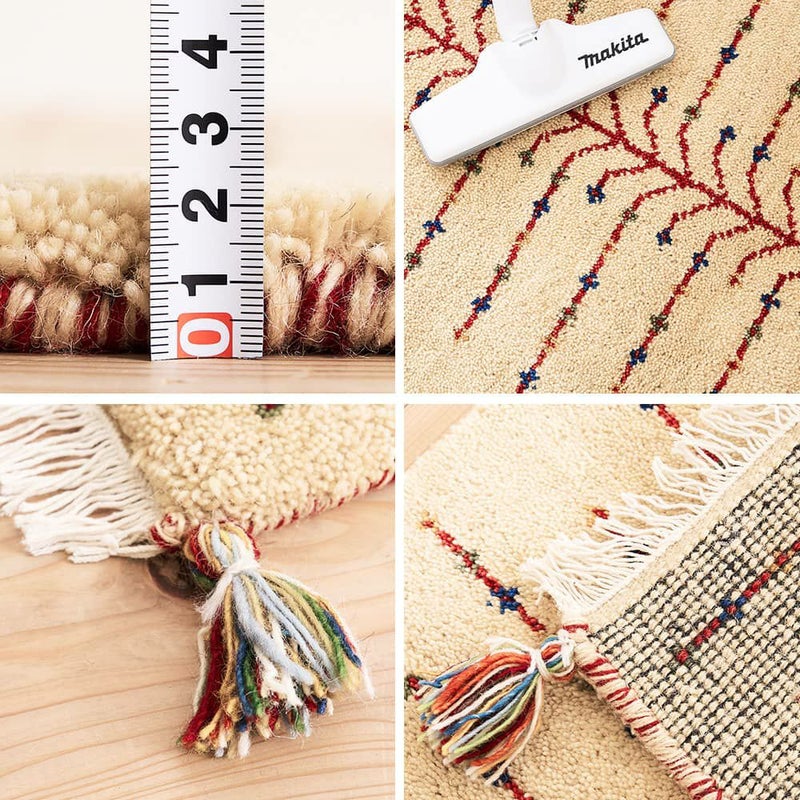 2cm程ある贅沢な厚みで、ギャッベならではの弾力を感じられます。手織りで丁寧に作られた上質な仕上がりと、サイドのフリンジもおしゃれなアクセントに。