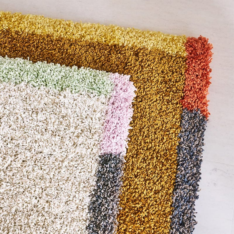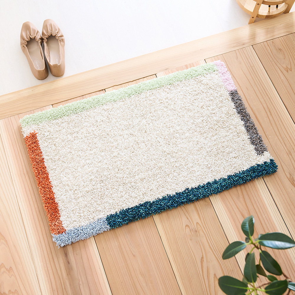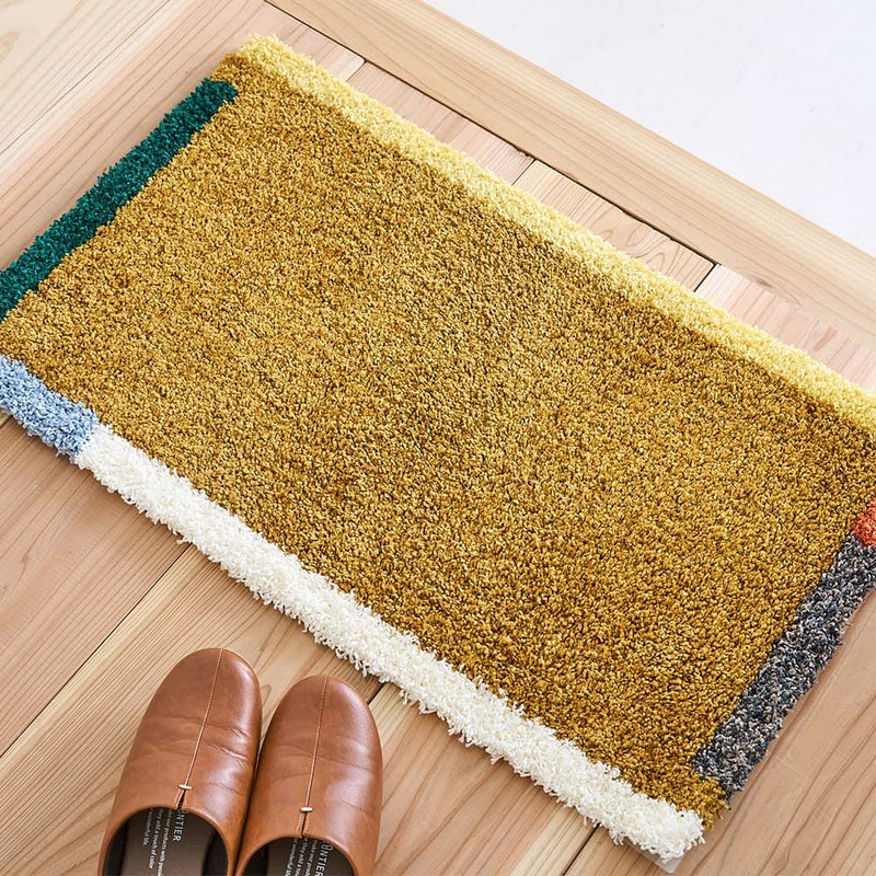 アクセントカラーの縁取りと光沢糸の使用が、空間に深みを加える「フレーム 玄関マット」。足元から始まる日常を、アートの様に色彩豊かに彩りを与えてくれます。