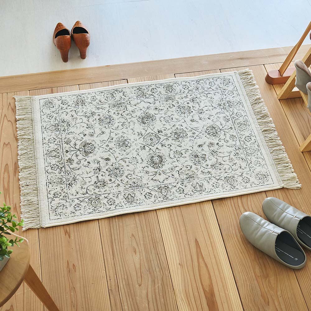 美しい光沢と繊細なアラベスク模様が織りなす気品あふれる一枚。主張が強すぎない優しいカラーリングはナチュラルテイストやモダンテイストをはじめ、さまざまなインテリアと美しく調和します。玄関にマットを敷けば、優雅な空間が広がり、訪れる人を心地よく迎え入れるでしょう。マットと共にワンランク上の空間を演出してみませんか。