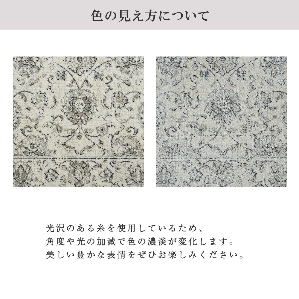 時を重ねたヴィンテージのような味わい深い風合いと、美しいアラベスク模様が魅力の一枚。その優しく上品なデザインはインテリアに溶け込み、お部屋を華やかに、そして深みのある空間へと昇華させます。光沢が加わることで、より一層高級感を漂わせる仕上がりです。