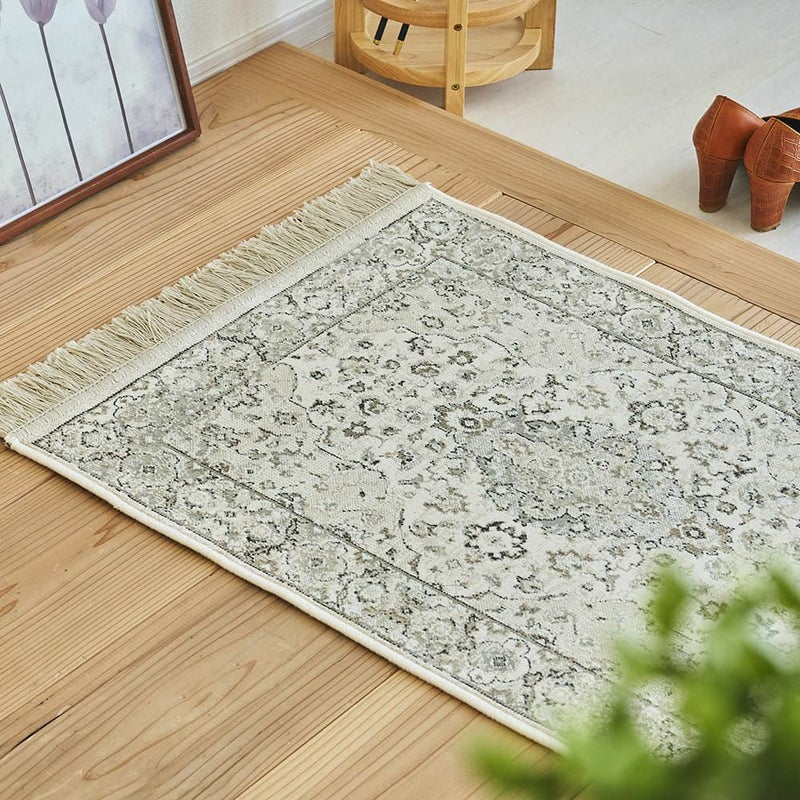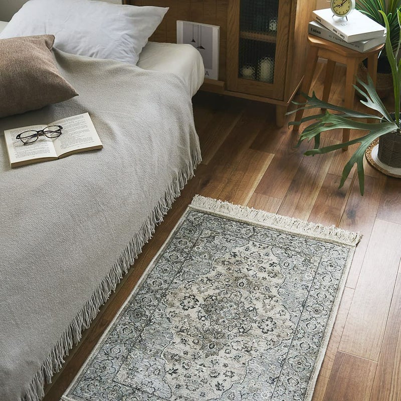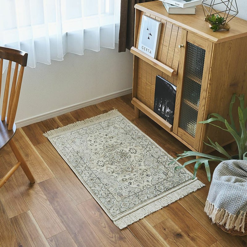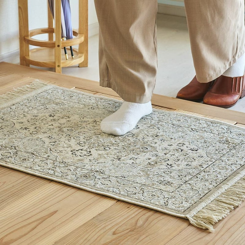 玄関だけでなく、ミニサイズのアクセントマットとして使うのもおすすめです。ベッドサイドや棚、鏡の前に敷くことで、お部屋の雰囲気をさりげなく引き立て、ワンランク上の上のインテリアを楽しめます。