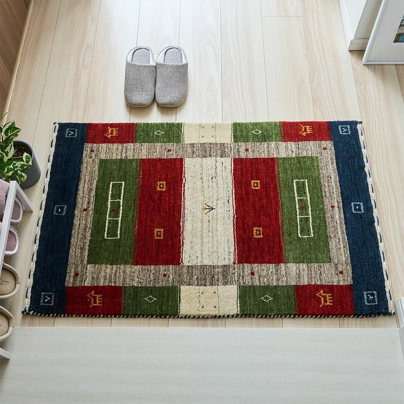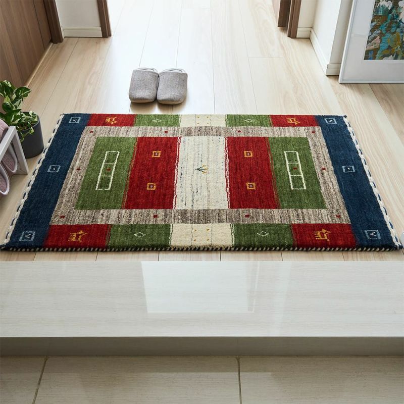 鮮やかな色の組み合わせがエスニックな雰囲気を感じる「アルマン 玄関マット」。さりげなく散りばめられたギャッベの紋様と、手織りならではの色ムラが生地に素朴な魅力をプラスしてくれて、インテリアに馴染みやすい一枚です。