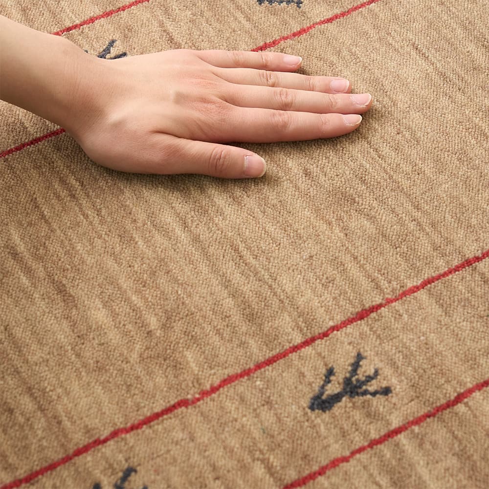 品種改良されたやわらかい羊の毛を使用することで生まれる、ソフトな肌触りがインドギャッベの魅力の一つ。思わずホッとするような柔らかな手触りをお楽しみください。