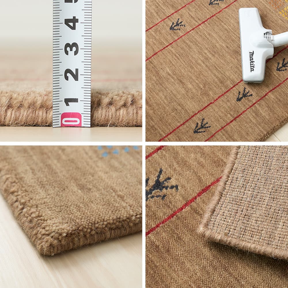 ギャッベのマットはお手入れが大変なのでは?と思われる方も多いですが、高密度で織られており、ギュッと目が詰まっているのでゴミやほこりが入りにくく、実はお手入れが簡単◎また、厚手で弾力があるので、踏み心地が良いのはもちろんのこと、床の傷や凹みからも保護してくれます。