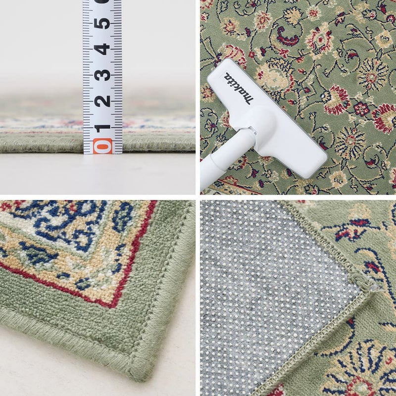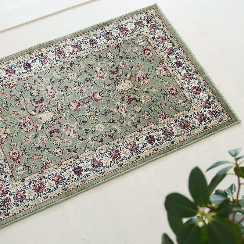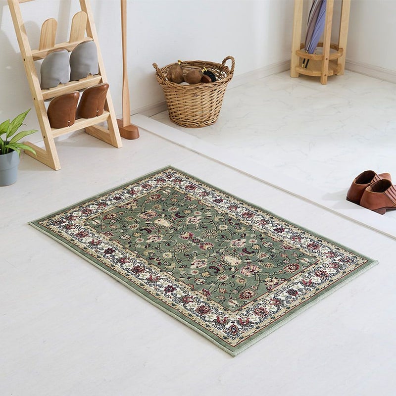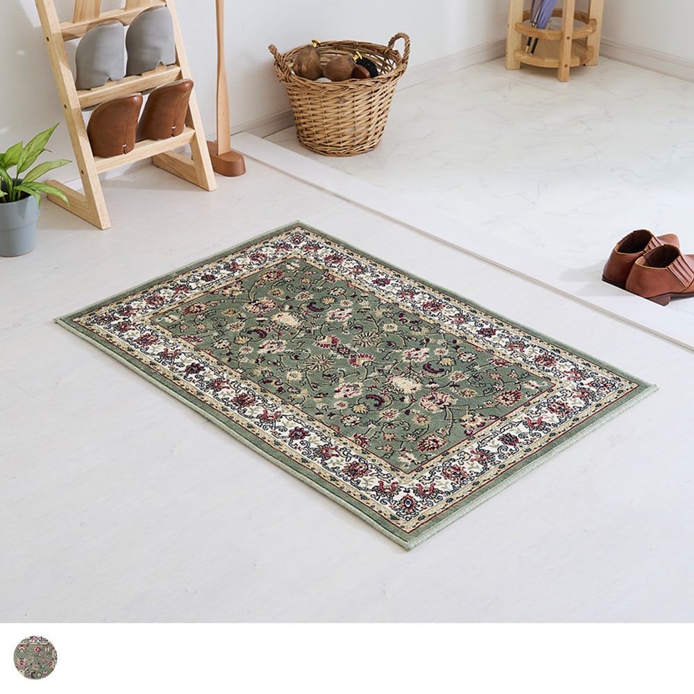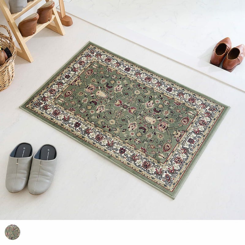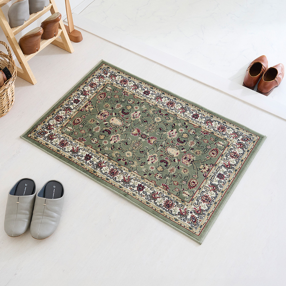 落ち着いたスモーキーグリーンに伝統のペルシャ絨毯柄が、そっと空間に馴染んで寄り添ってくれる「アシェム 玄関マット」。モケット織りのなめらかな手触りが上質さを感じさせる玄関マットで、玄関を高級感あふれる空間に演出してみませんか?