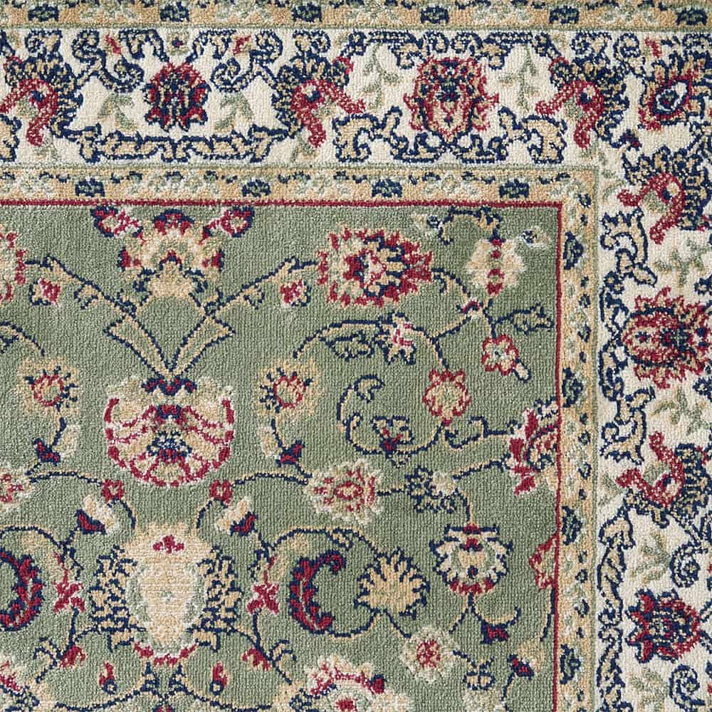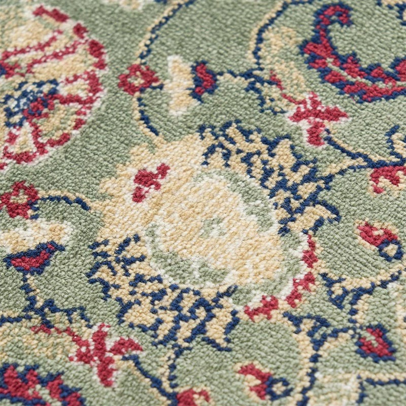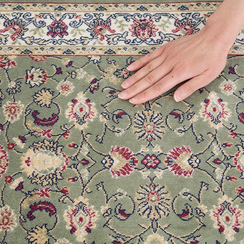 モケット織りならではの滑らかな手触りとレーヨン素材の微かな光沢感が魅力の「アシェム 玄関マット」。唐草模様を全体にあしらった伝統のペルシャ絨毯柄と、スモーキーグリーンが空間と調和する、見ても触れても納得の上質な一枚です。