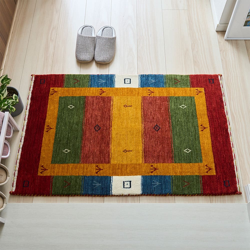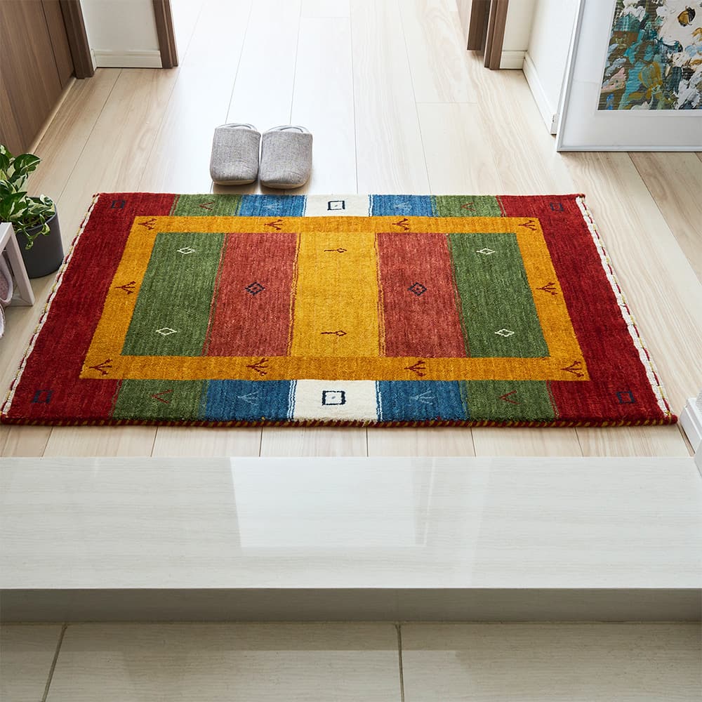 カラフルな配色が印象的なインドギャッベ「アーティン 玄関マット」暖かみのある素朴な柄をあしらいつつ、アートのようにお部屋を飾れます。「色」の魅力を肌で感じられるラグを敷いて、自然と感性が磨かれていく日々を過ごしてみませんか?
