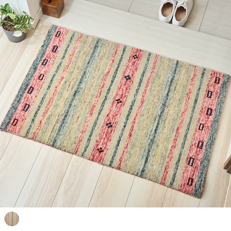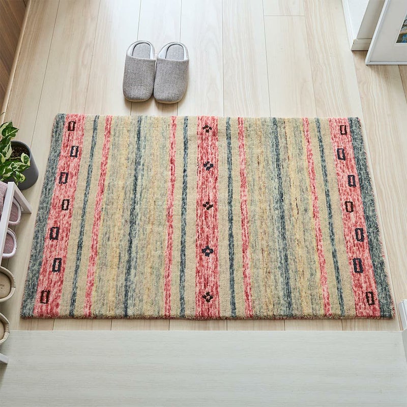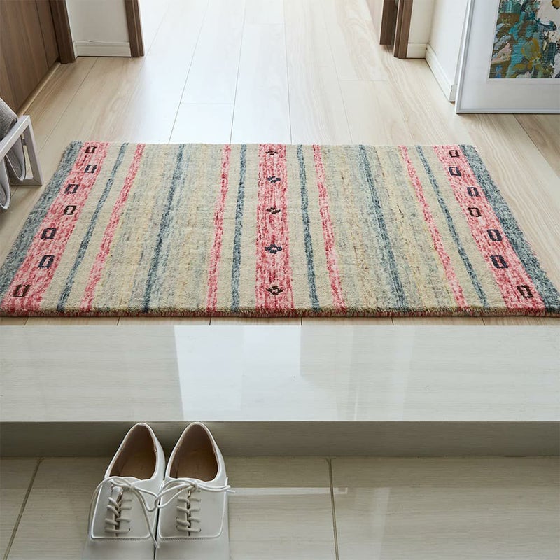 ポップな配色でユニークな雰囲気に仕上げたインドギャッベの「アザディ 玄関マット」。カラフルなストライプデザインが明るい気持ちで1日を始められそうな一枚です。